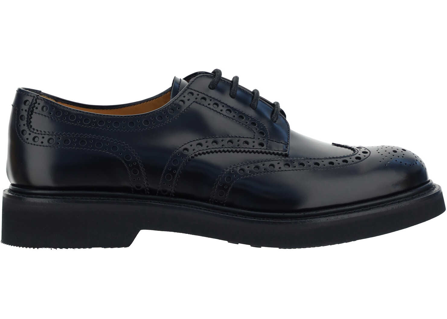 CalfskinLace-Up Shoes by Church's, elongated toe, front lace-up closure, slight leather block heel, patent leather design, press-on logo insole.