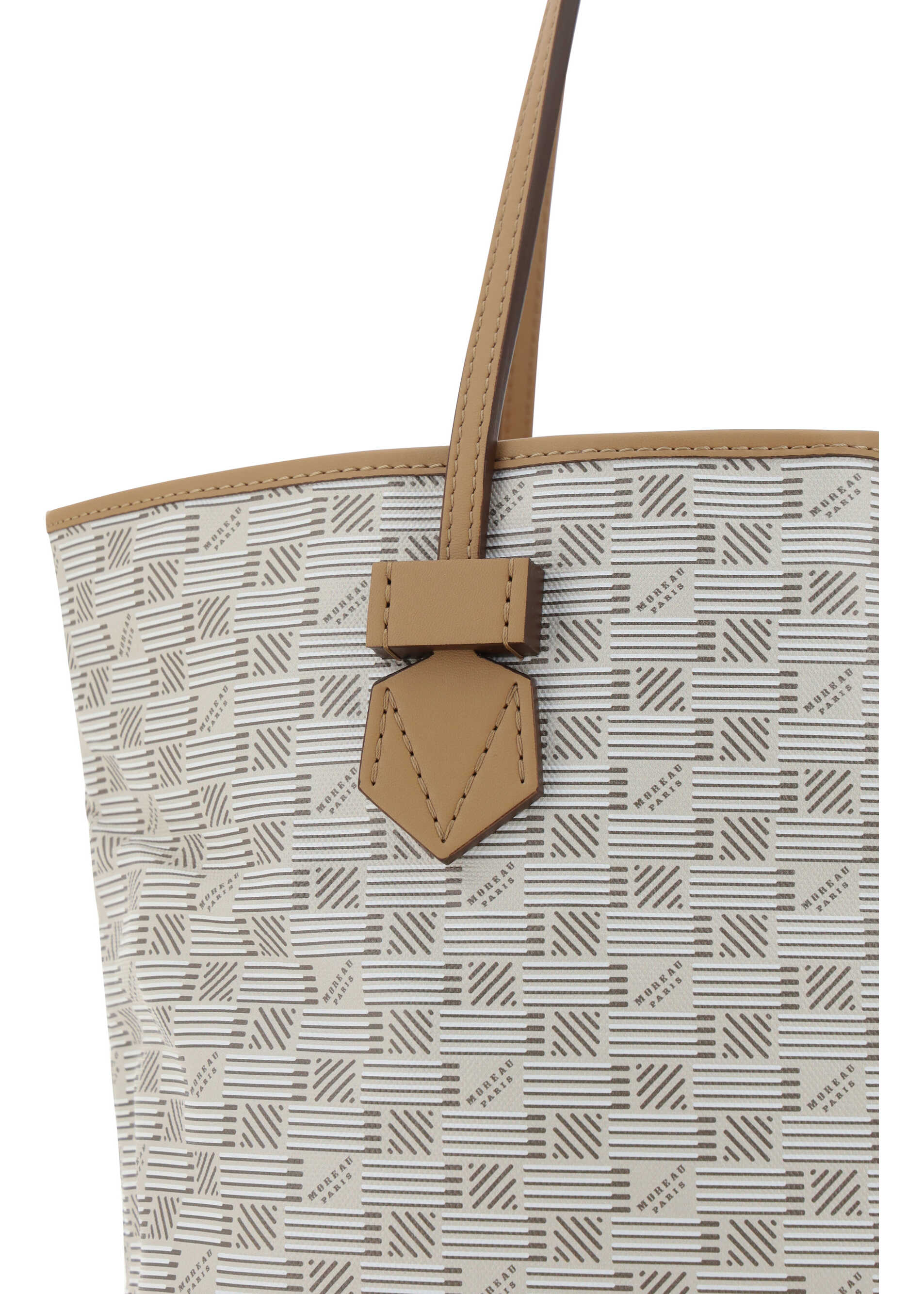 Saint Tropez Tote Medium Cotton Shoulder Bag by Moreau, two flat faux leather handles, single interior compartment, interior zippered welt pocket, hook-and-eye closure at top, iconic brand monogram repeated all-over.