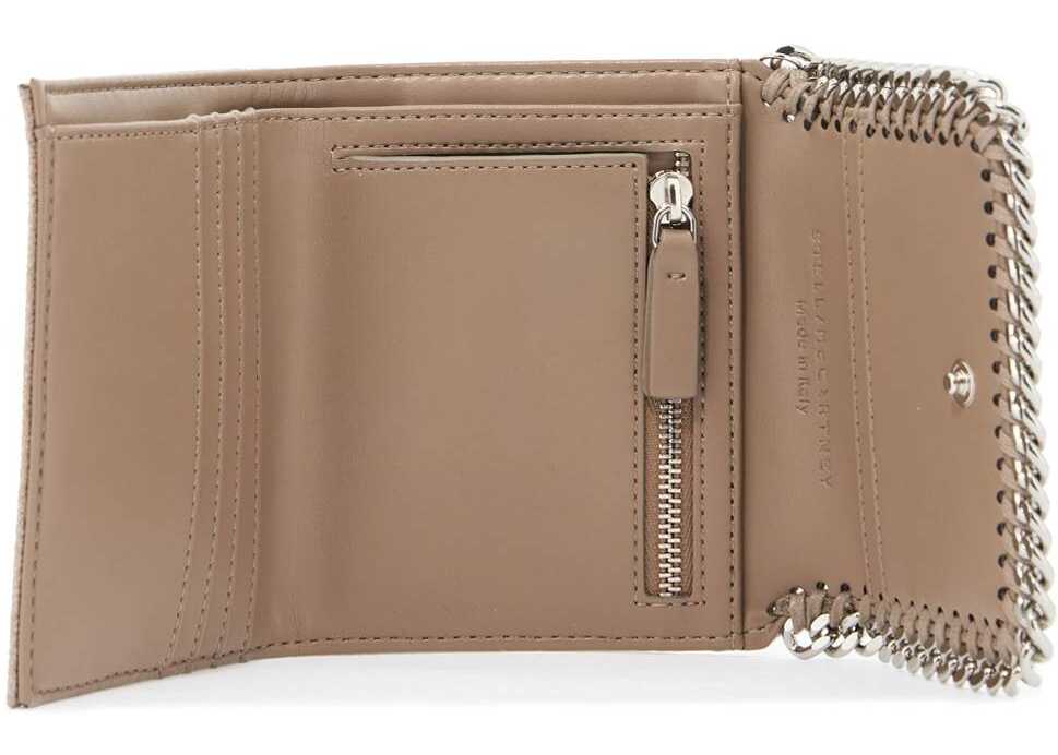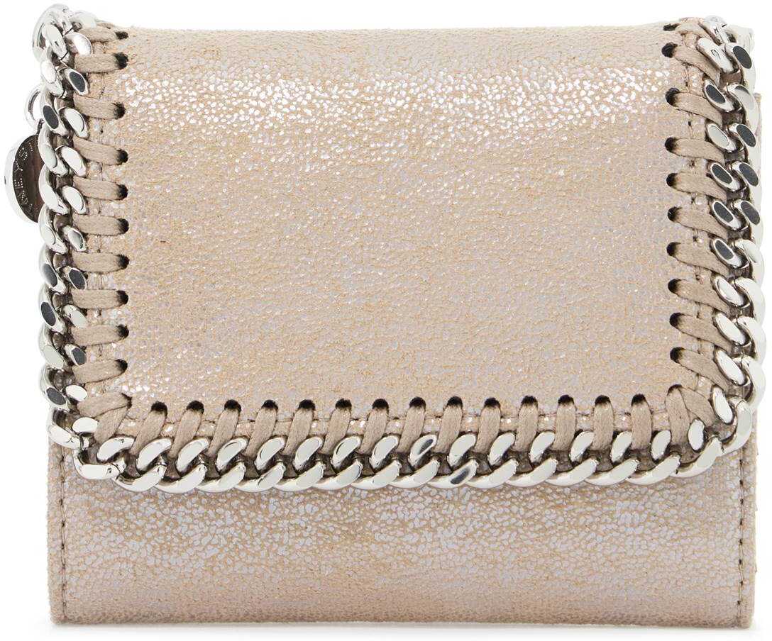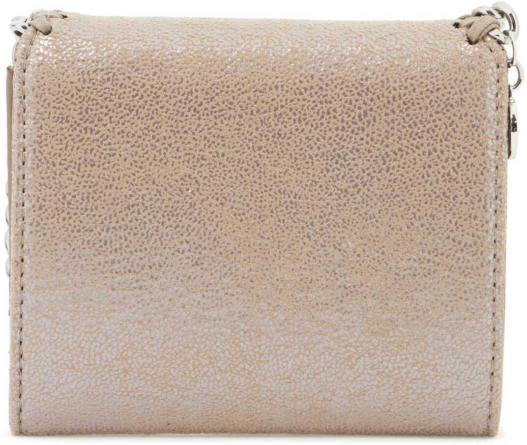 The small Falabella wallet by Stella McCartney is made of shaggy deer eco-leather and features a flap with a chain detail on the edges and the iconic Logo charm. It has a snap button closure, a lined interior in eco-leather and fabric with a compartment for bills, a ticket pocket, a zippered coin pocket, six credit card slots, and an embossed logo. The accessories are finished in silver metal.