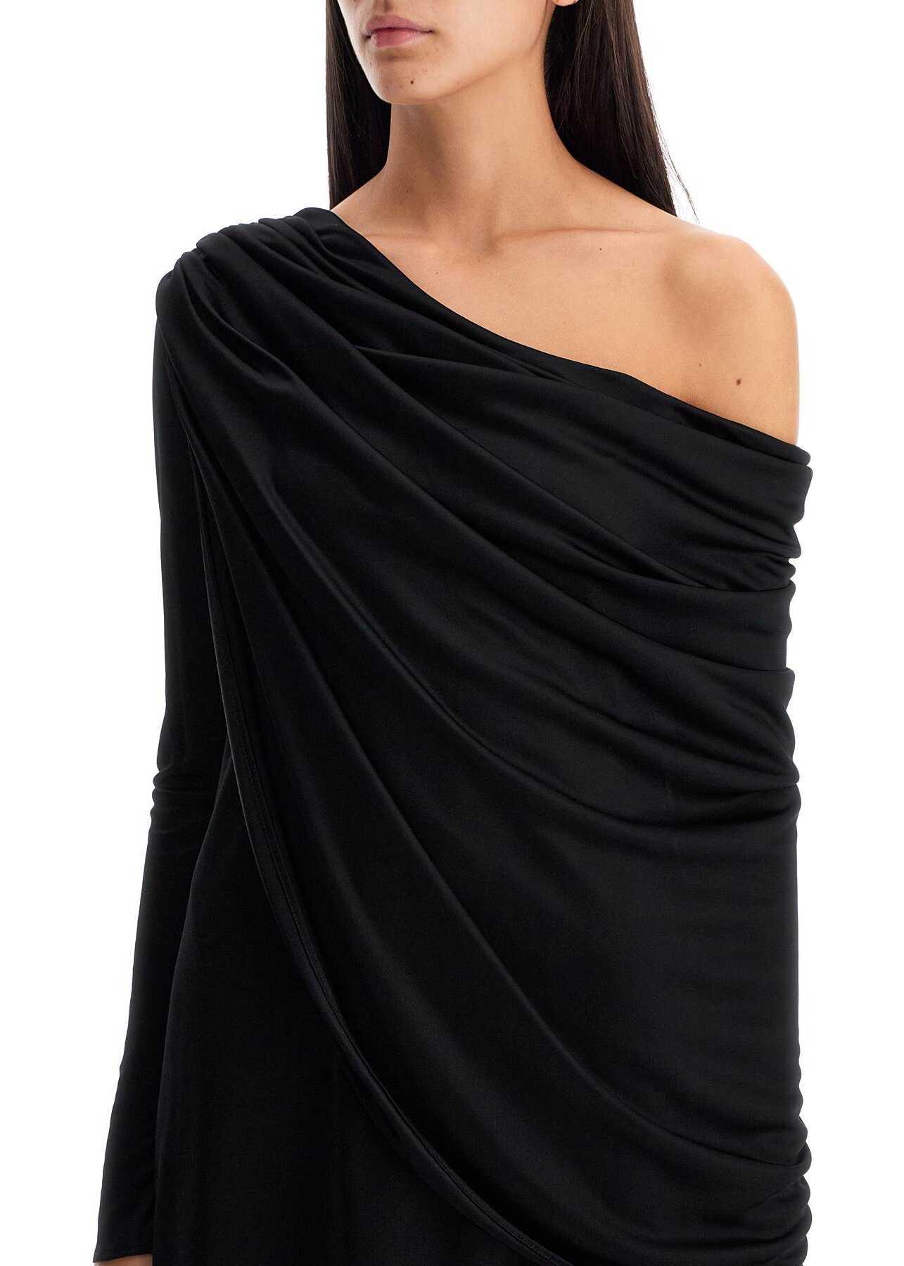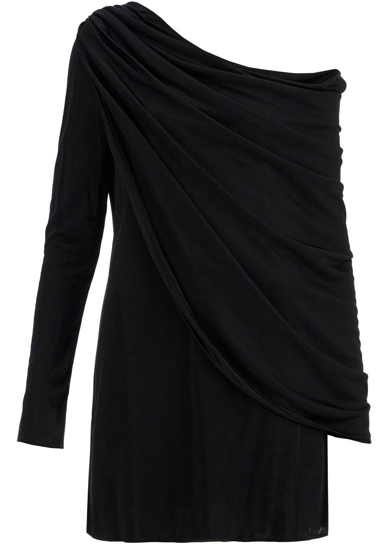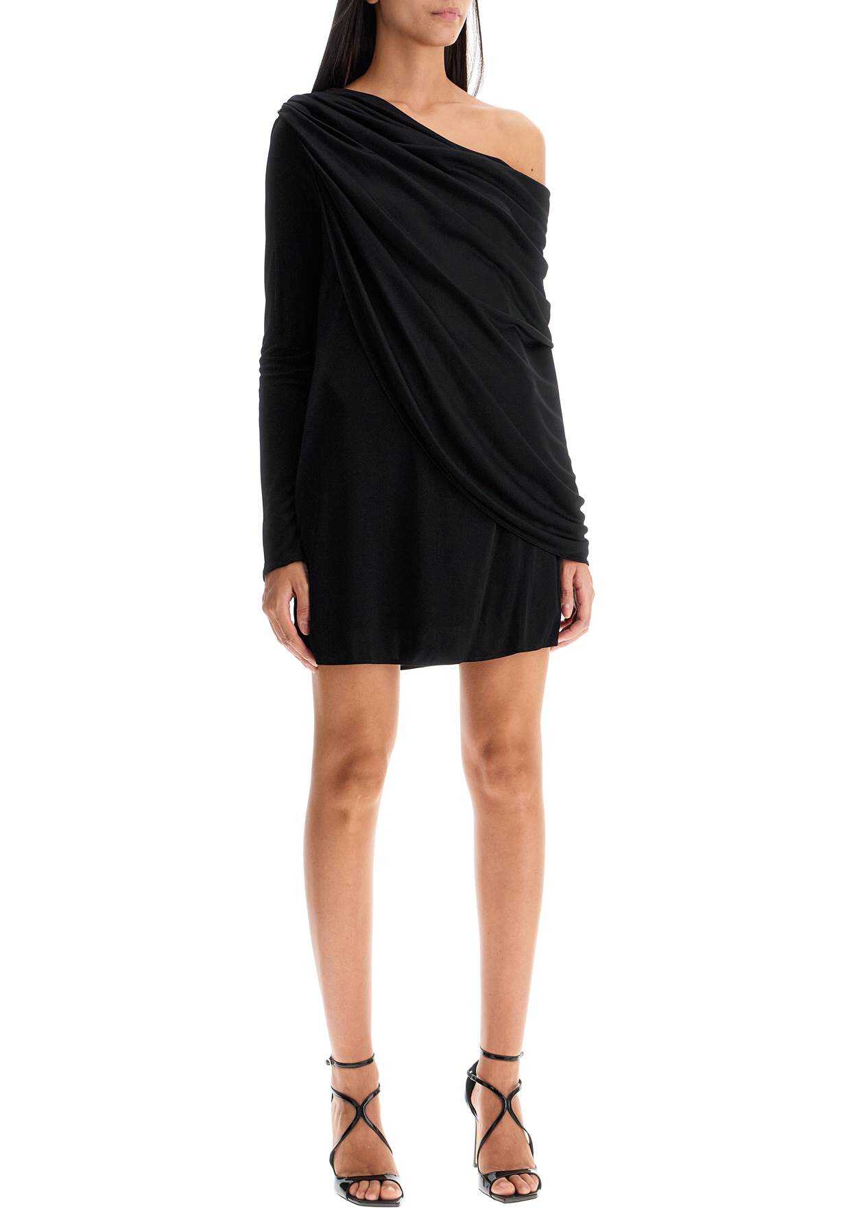 This shiny jersey mini dress by Giuseppe Di Morabito features a fluid silhouette with long sleeves and an asymmetrical neckline, enhanced by a draped overlay on the shoulder. The model is 177 cm tall and wears size IT 40.
