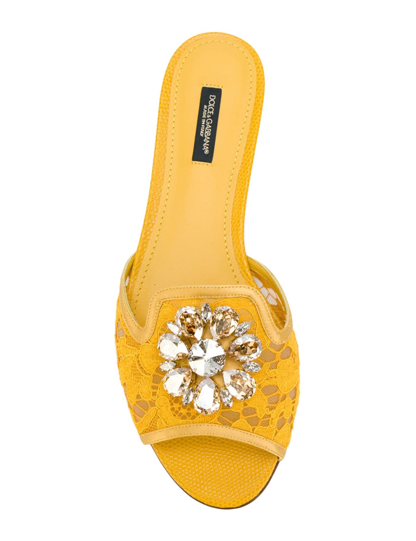 - These sunshine yellow embellished Bianca flat lace sandals from Dolce & Gabbana are made from luxurious silk and have been finished in the Italian fashion house’s elegant floral lace. Featuring an open toe, sparkling crystal embellishments, a brand embossed insole and a flat sole, these pretty embellished lace sandals simply slip-on - refined summer dressing could not be easier.