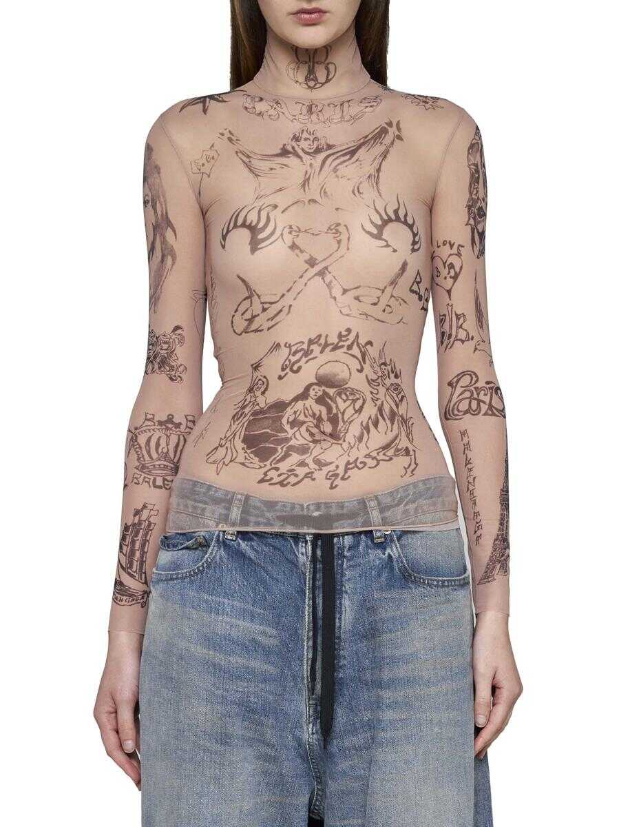 Balenciaga’s long-sleeved top in nude transparent tulle featuring all-over Tattoo print, mock neck and fitted silhouette. Size Type: International