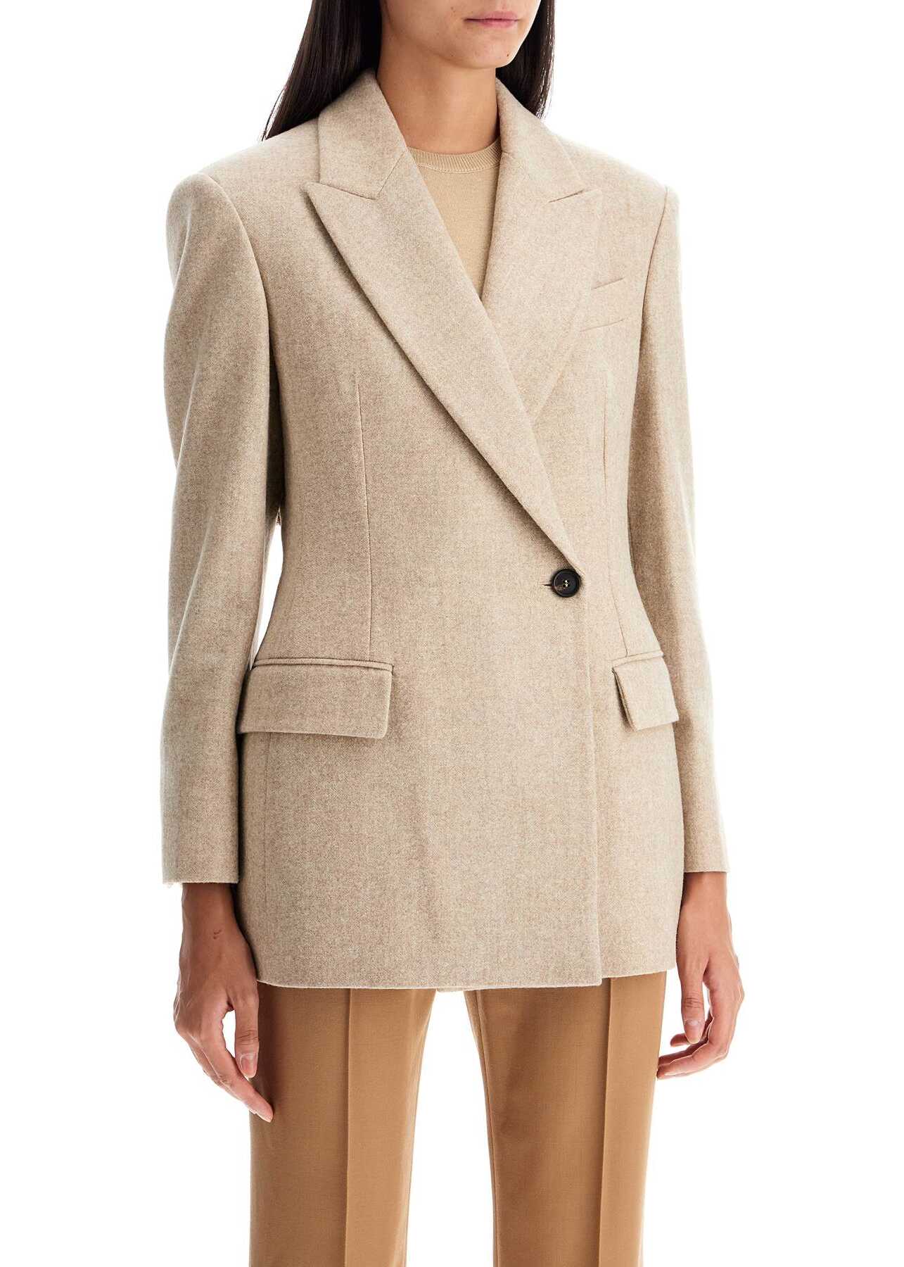 This Brunello Cucinelli double-breasted jacket is made of soft alpaca blend fabric. It stands out for its double-breasted construction with a single visible button and a fitted silhouette with slightly padded shoulders. Adorned with a Monile detail on the back of the collar, the jacket is completed by a notched lapel, flap pockets, a chest pocket, and a central back vent. The lining is made of a silk blend. The model is 177 cm tall