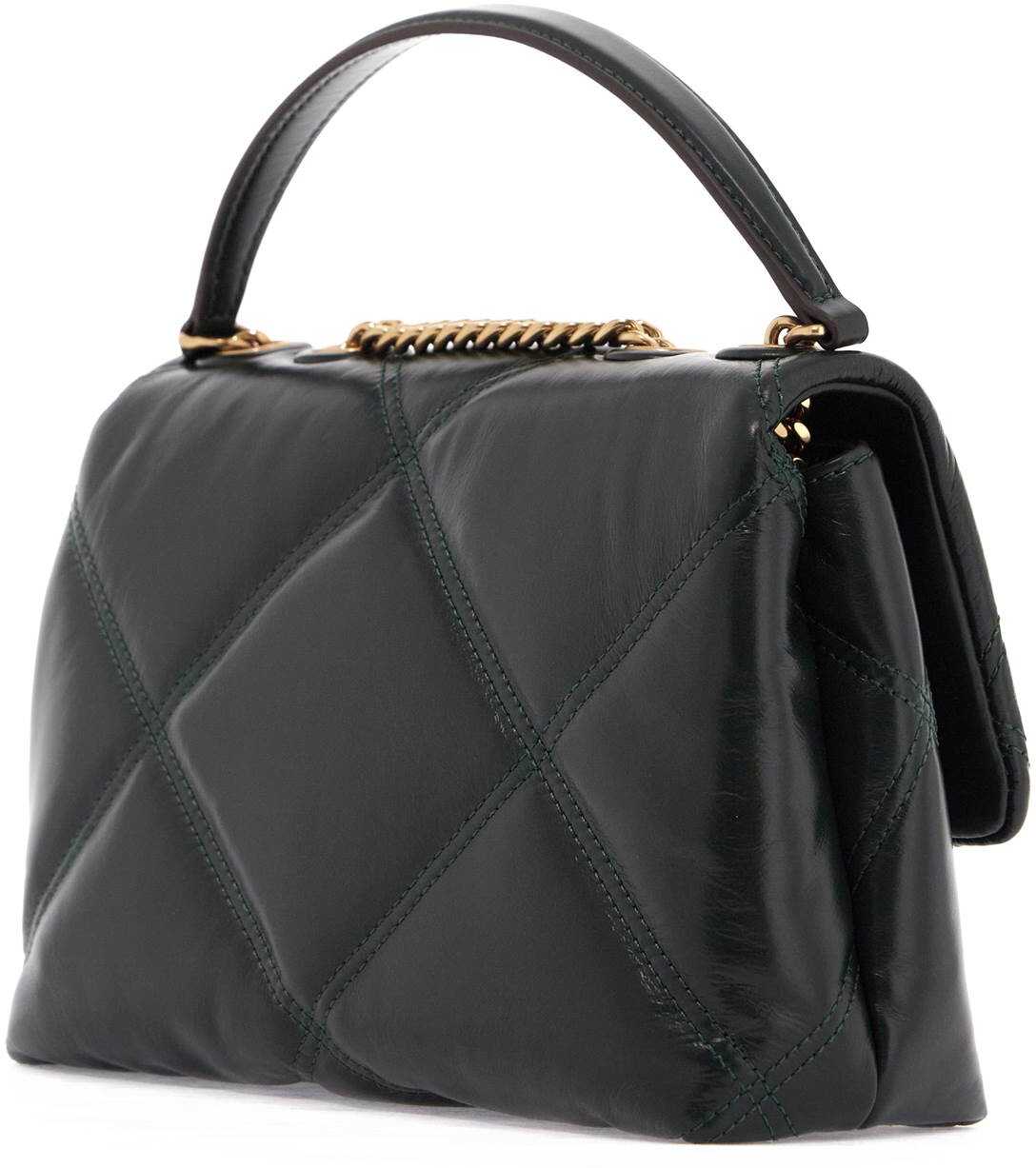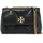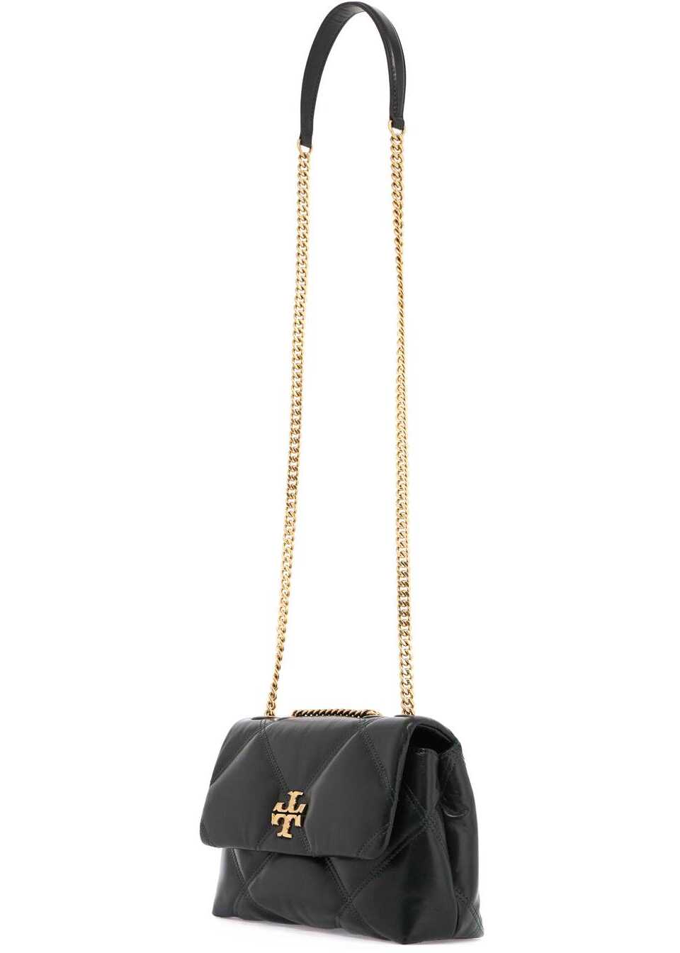 The small Kira shoulder bag by Tory Burch is made of quilted nappa leather with a diamond pattern. The flap has a magnetic closure and is adorned with the iconic double T metal logo on the front. The interior is lined with fabric and features one zip pocket and one open pocket. The design can be converted thanks to the chain strap, which can be doubled for a shoulder look.