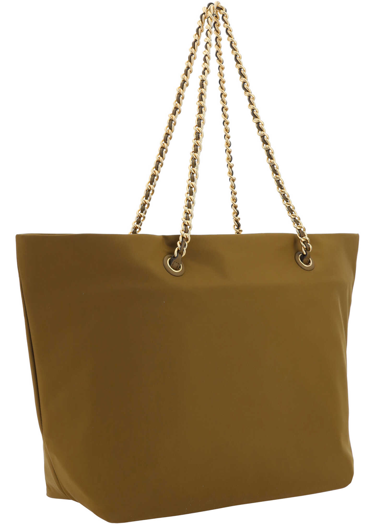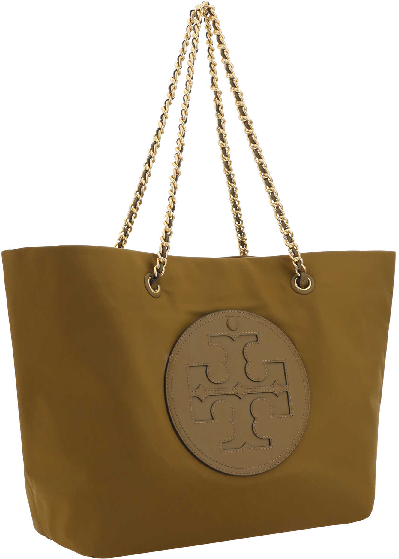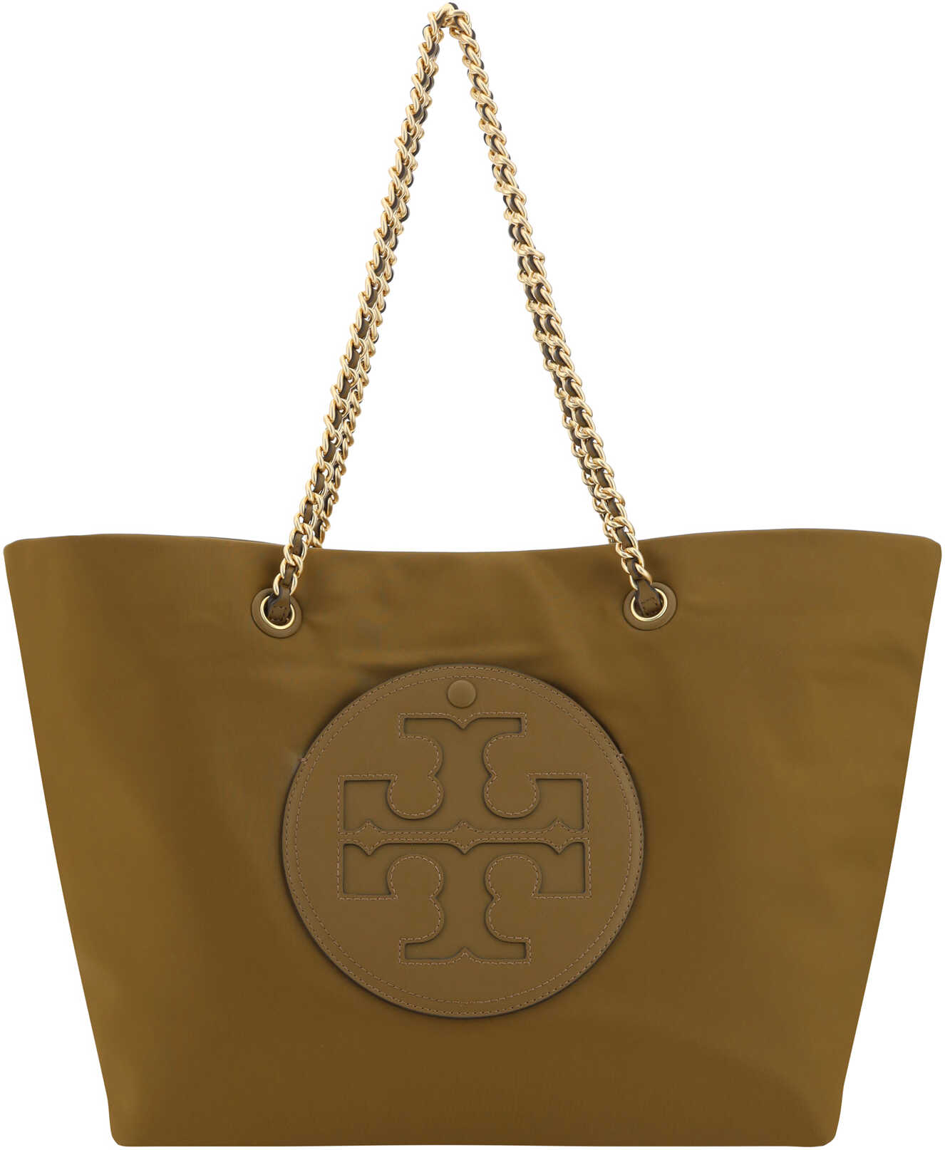 Ella Tote Shoulder Bag by Tory Burch, canvas design, two removable sliding chain top handles, one internal welt pocket, iconic brand logo embossed on the front.