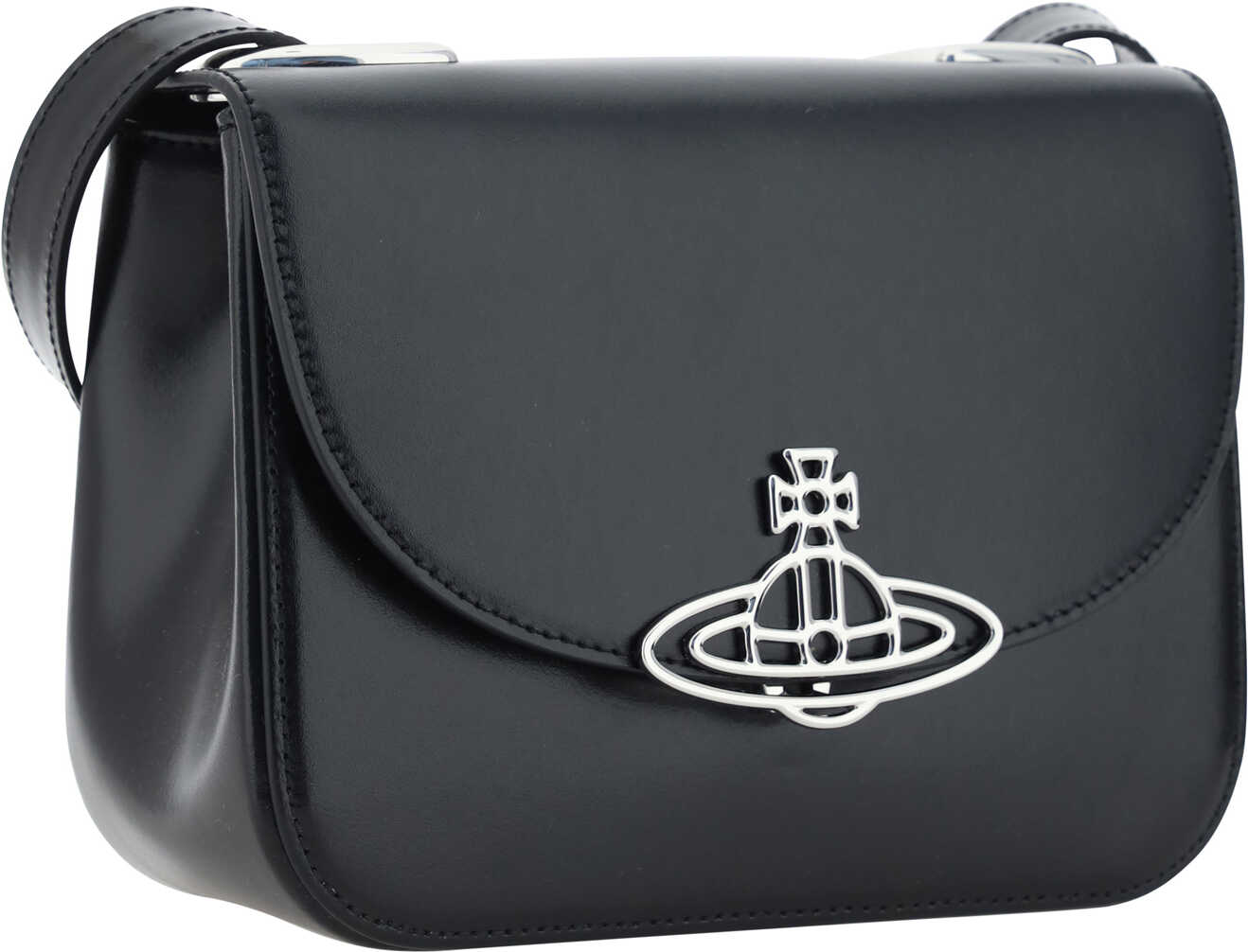 Linda Leather Shoulder Bag by Vivienne Westwood features adjustable flat leather shoulder strap, interior card slot, front magnetic flap closure, smooth leather design, iconic logo applique on front.