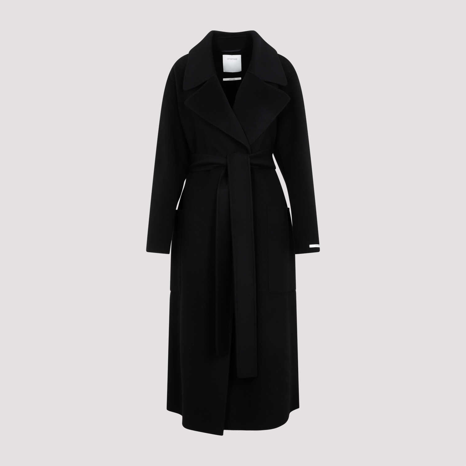 Sportmax Veleno Black Virgin Wool Coat. Crafted in pure black virgin wool, long sleeves, wide notched lapel, side pockets, tonal belt on waist, hand-sewn.