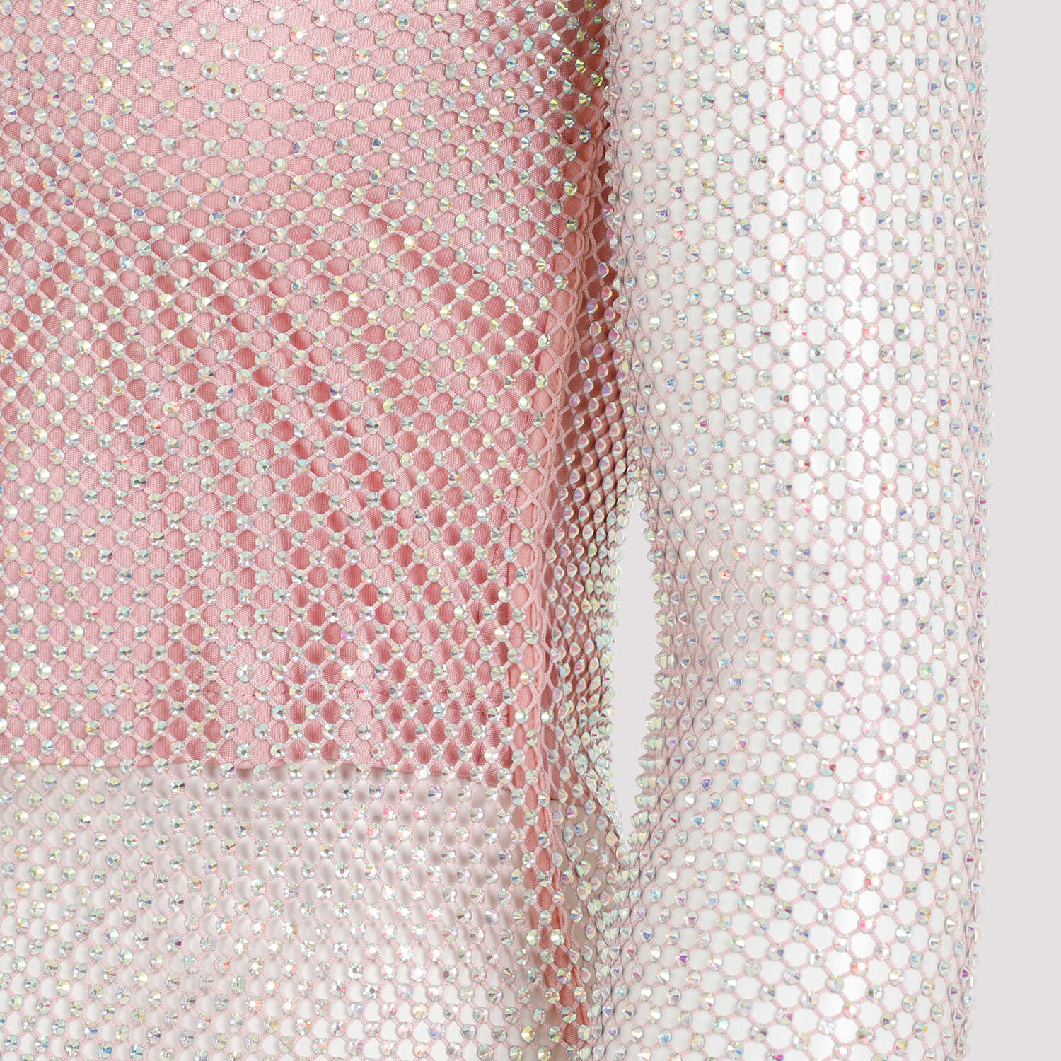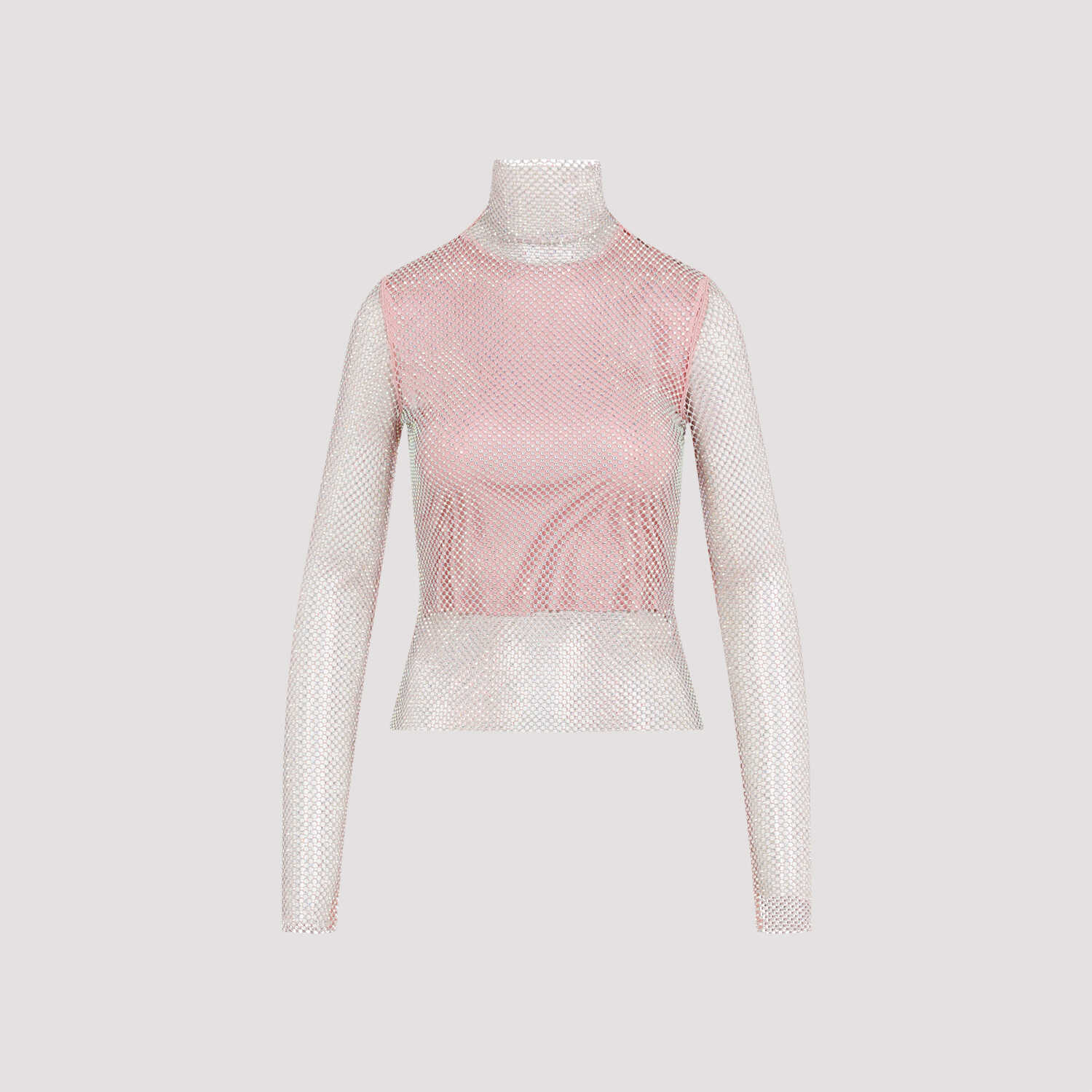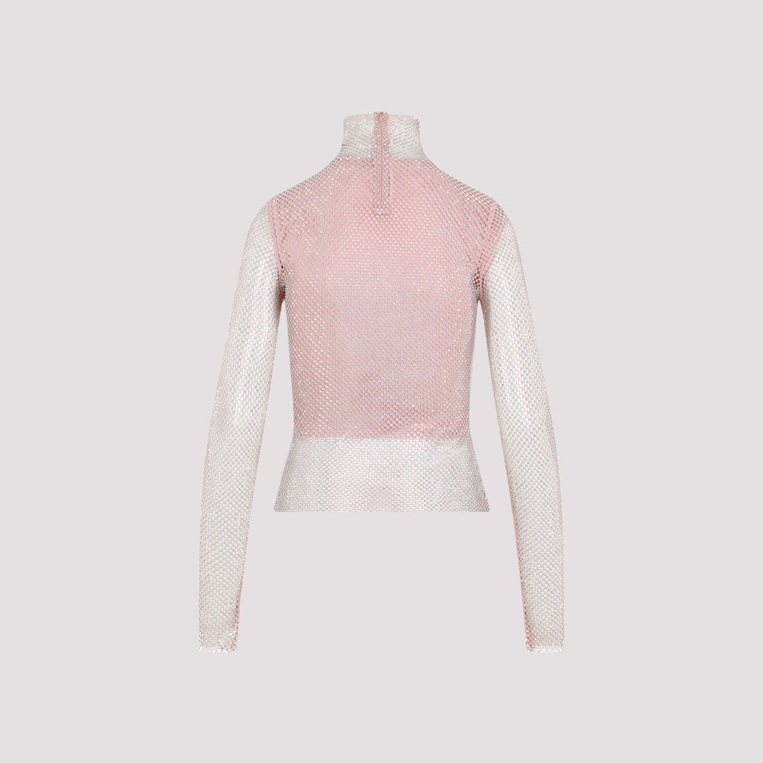 Sportmax Valdai Crystal Pink Viscose Top. Pink mesh adorned with rhinestones all over, standing collar, long sleeves, concealed zip closure at the back central neck, viscose sleeveless top lining.