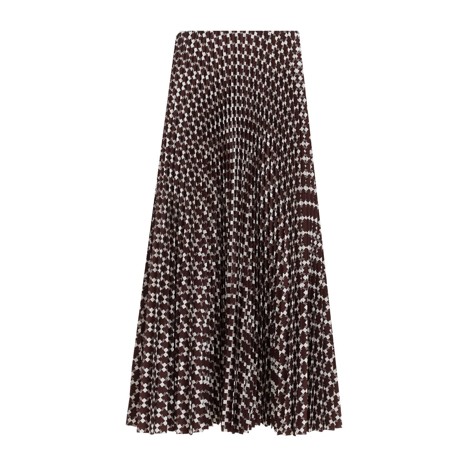 Ralph Lauren Collection Trivelas Brown Cream Polyester Maxi Skirt. Brown pleated tech fabric, geometric pattern all over, concealed zip closure, full length.