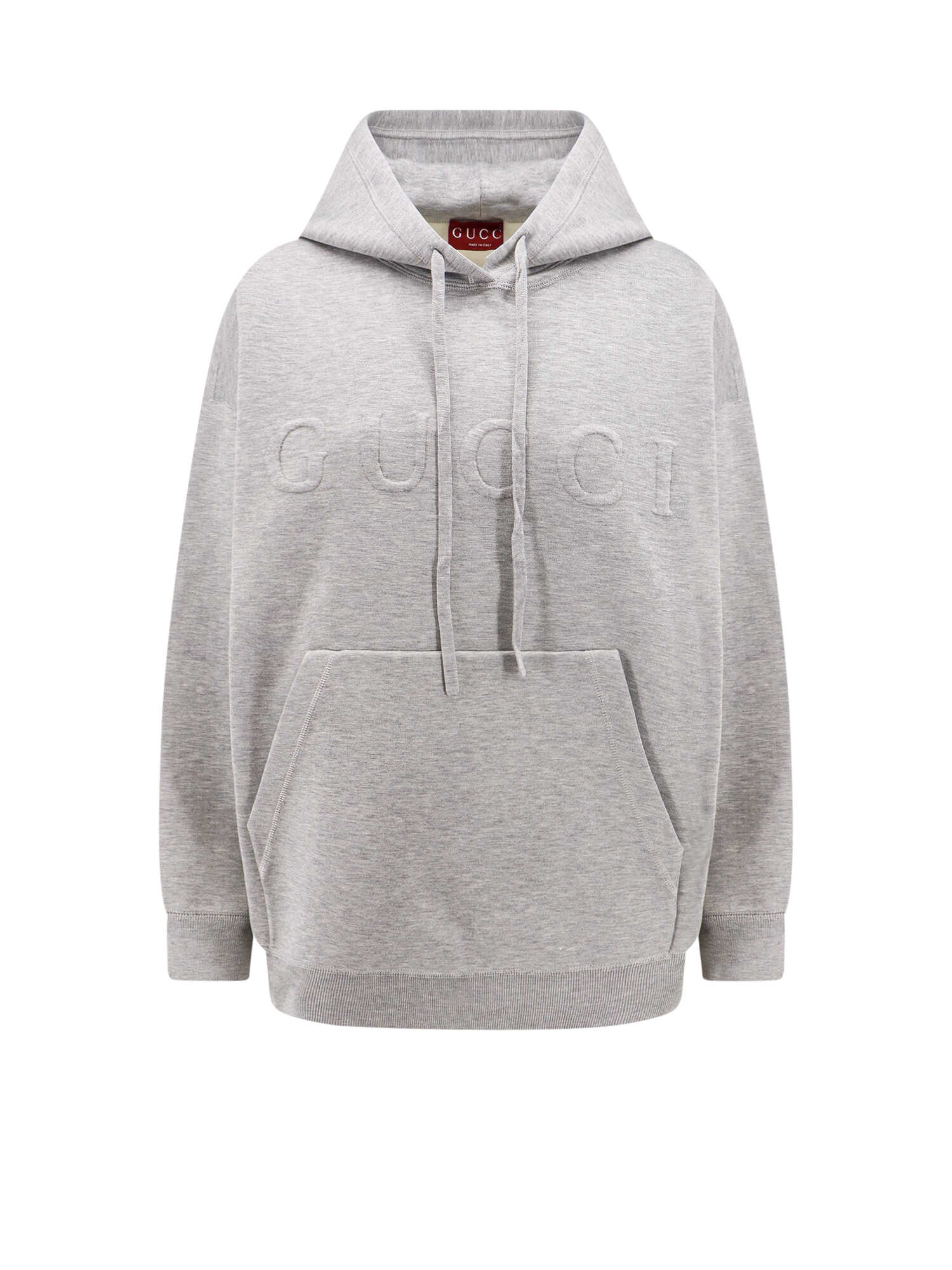 Stay cozy and stylish in this Grey Gucci sweatshirt featuring a hood with drawstring, kangaroo pocket, and ribbed profiles. Made in Italy with a luxurious blend of wool, viscose, polyamide, elastane, and silk. Perfect for a casual yet elegant look. Add this designer piece to your wardrobe today!
