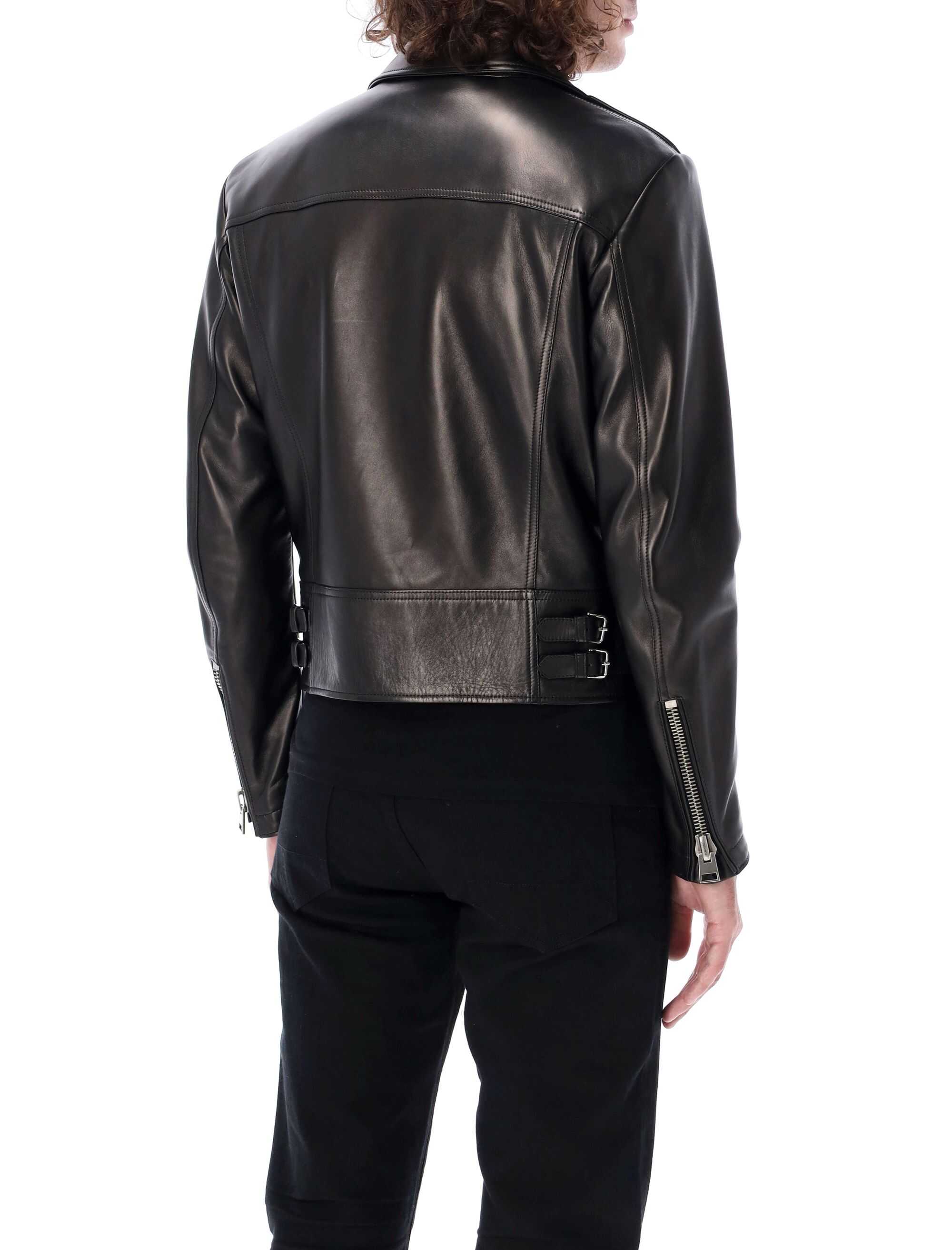 Elevate your style with this sleek black Biker nappa jacket by Tom Ford. Made from high-quality lamb leather, this slim-fit jacket features a classic biker collar, zip cuffs, and multiple zippered pockets. Perfect for the modern man who values quality and style. Embrace the luxury of Tom Ford.