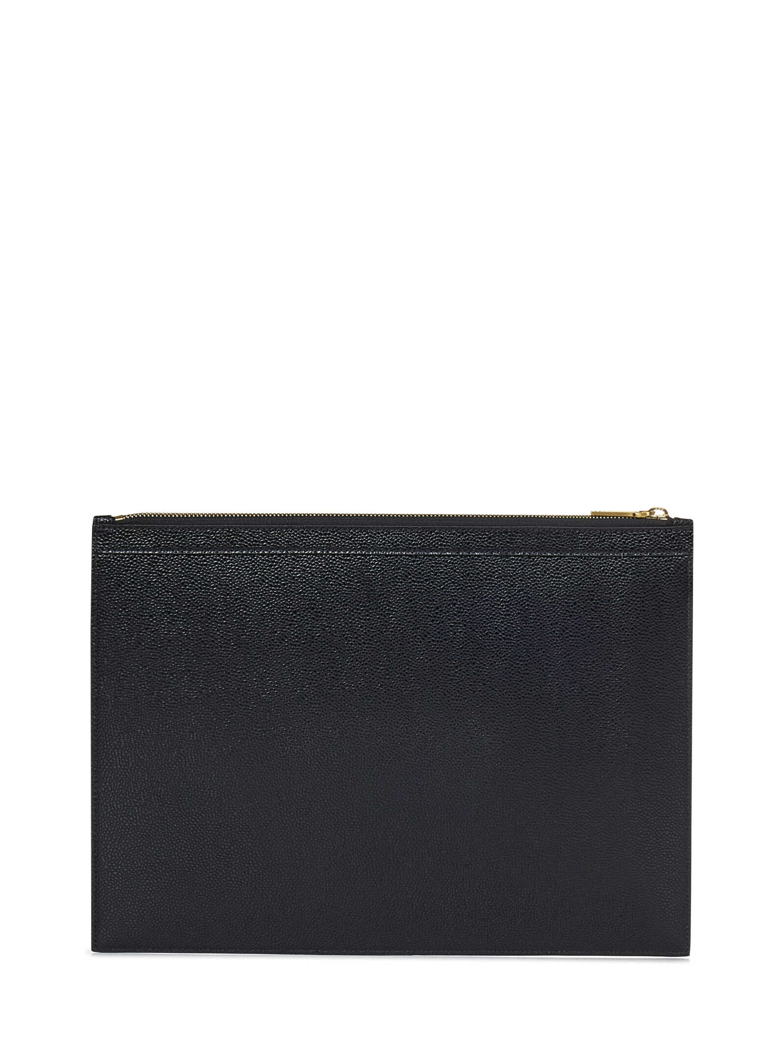 Elevate your style with this sleek black leather document holder clutch from THOM BROWNE. Crafted from 100% calfskin leather, this accessory features a tricolor loop and logo on the front. Perfect for keeping your essentials organized in style. Height 25cm, Width 35cm.