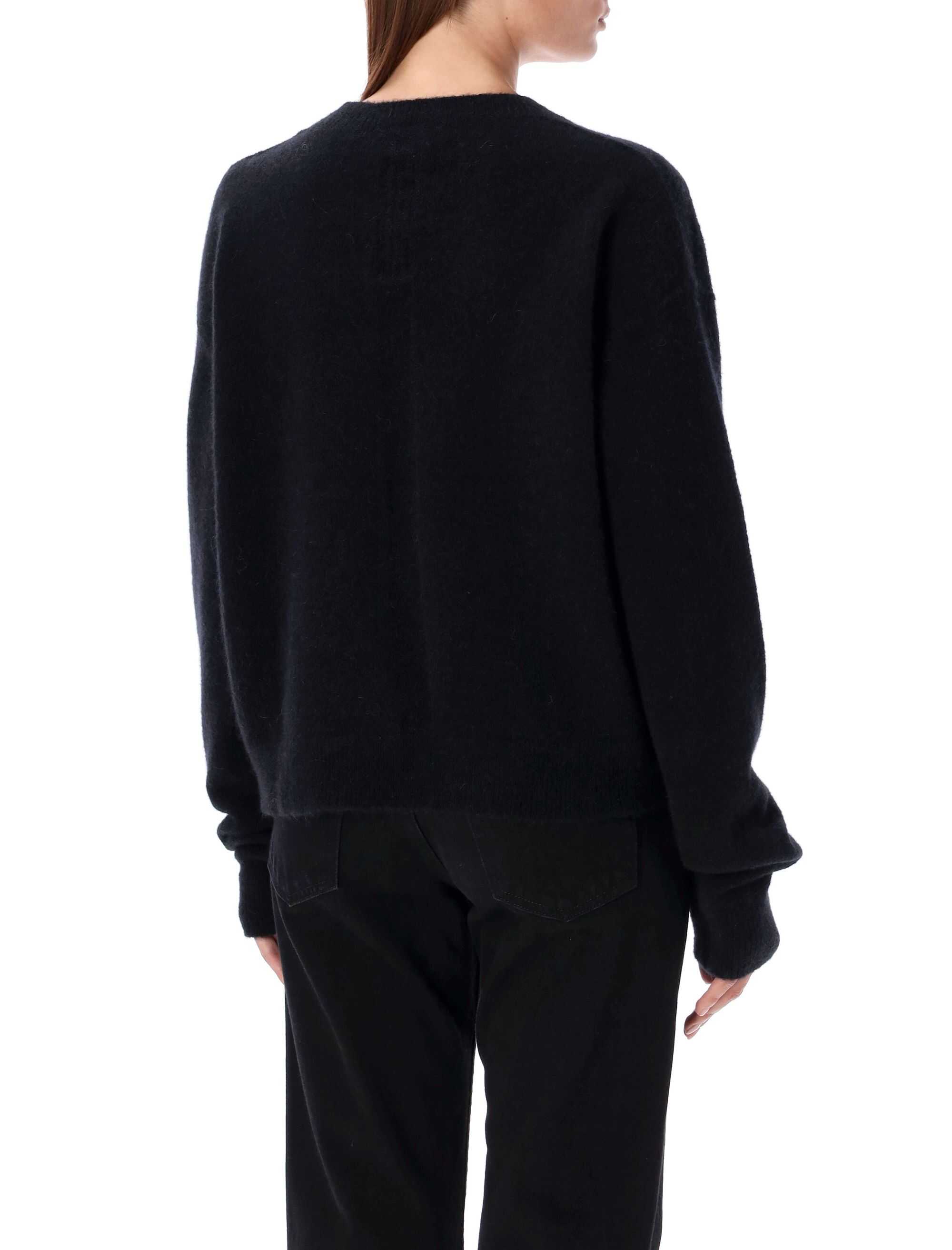 Stay cozy and chic in this black Tommy V-neck sweater by Rick Owens. Made with a luxurious blend of alpaca wool and nylon, it features an oversized fit, V-neckline, and ribbed hem and cuffs. Perfect for a fashionable winter look. Model is 1,72 and wears size S.
