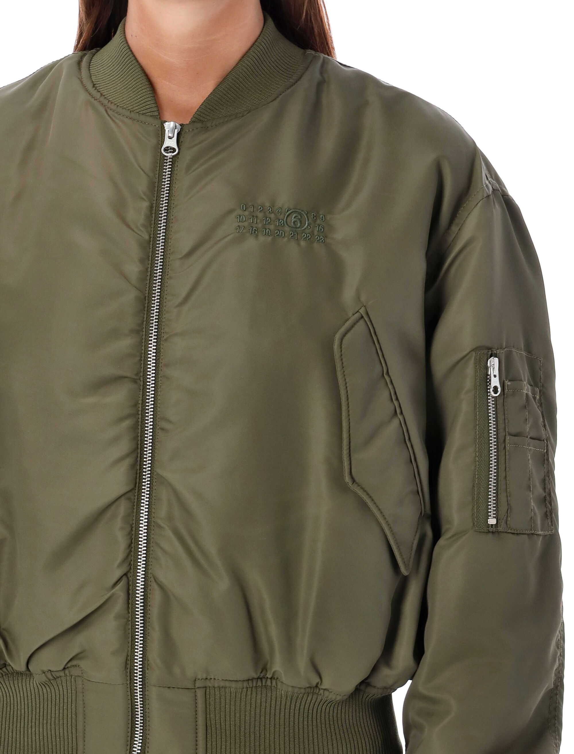Stay on-trend with this stylish KHAKI Bomber nylon jacket by MM6 Maison Margiela Kids. Made with high-quality 100% polyamide material, it features an oversized fit, ribbed collar, cuffs, and hem, and a signature logo on the chest. Perfect for adding a fashionable touch to your outerwear collection. Get yours now!