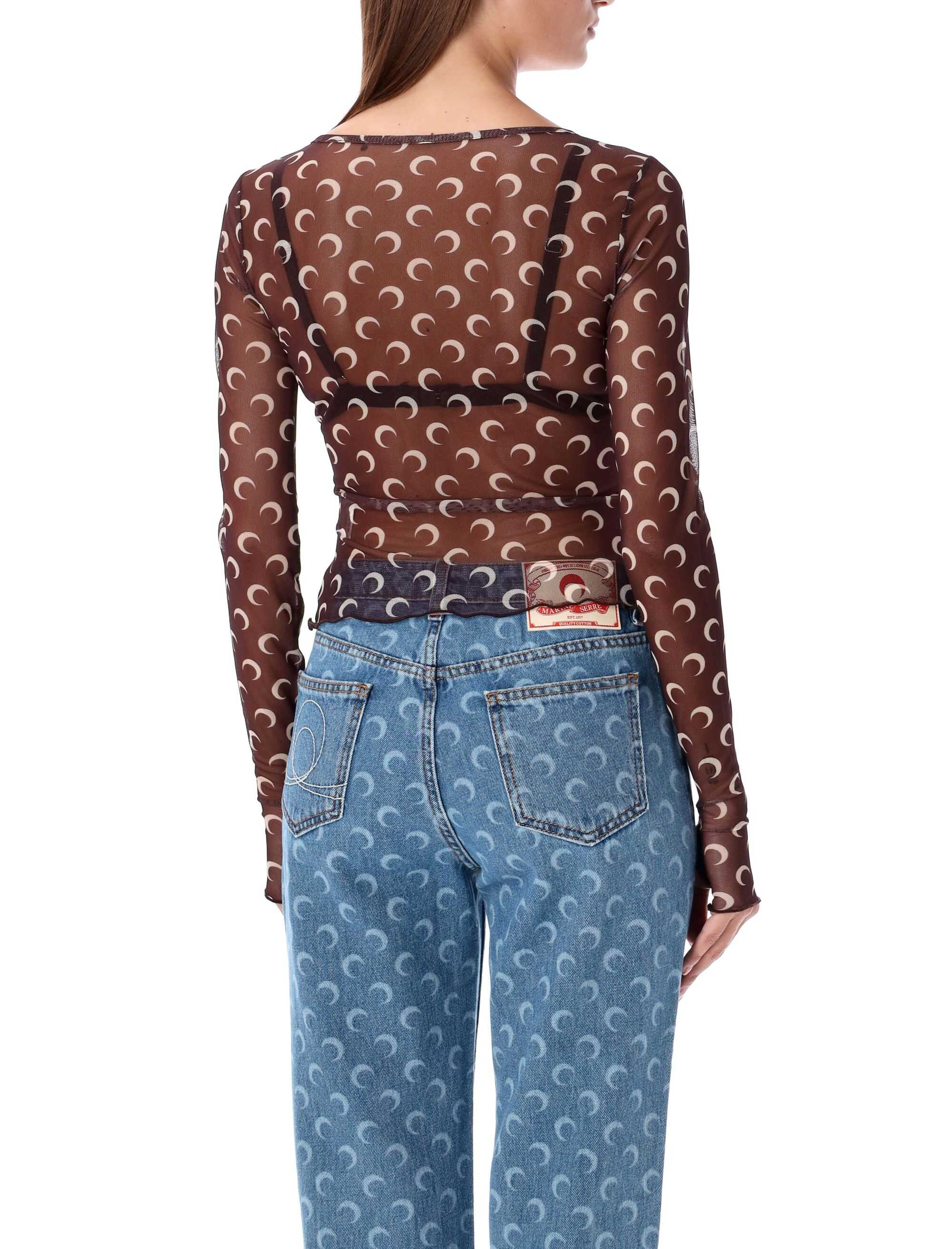 Elevate your style with this Mesh moon crew neck top by Marine Serre. Made from a stretchy mesh fabric, it features a slim fit, round neckline, and all-over moon print. Perfect for adding a touch of celestial charm to your wardrobe. Model is 1.72m and wears size S. Embrace the unique and trendy design of this top now!