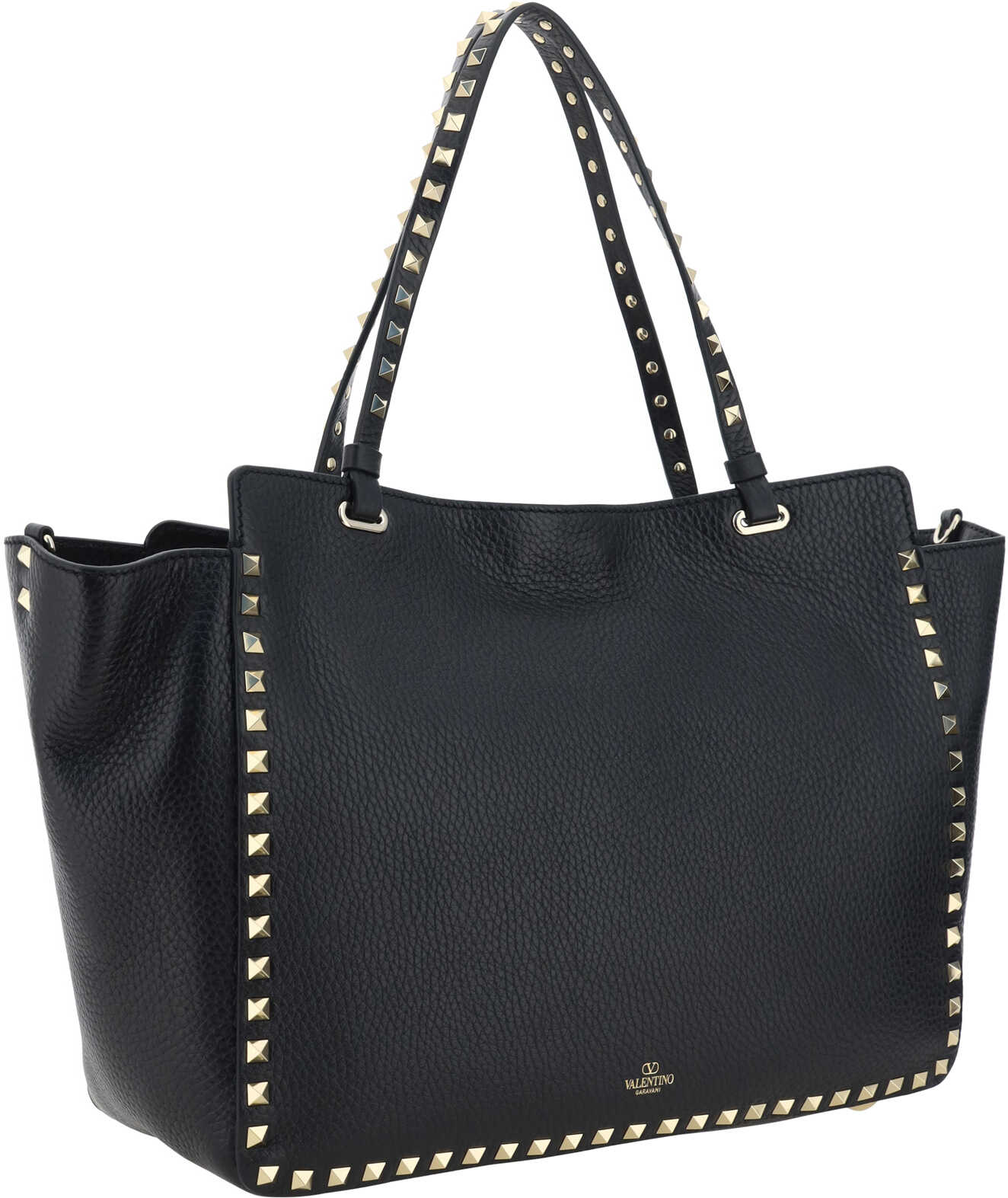 Leather Rockstud Medium Handbag by Valentino Garavani, front closure by swivel system, double slim handles at top, adjustable and removable shoulder strap, iconic brand studs applied in contrast on profiles, single compartment, iconic brand monogram printed in contrasting pressure on front.