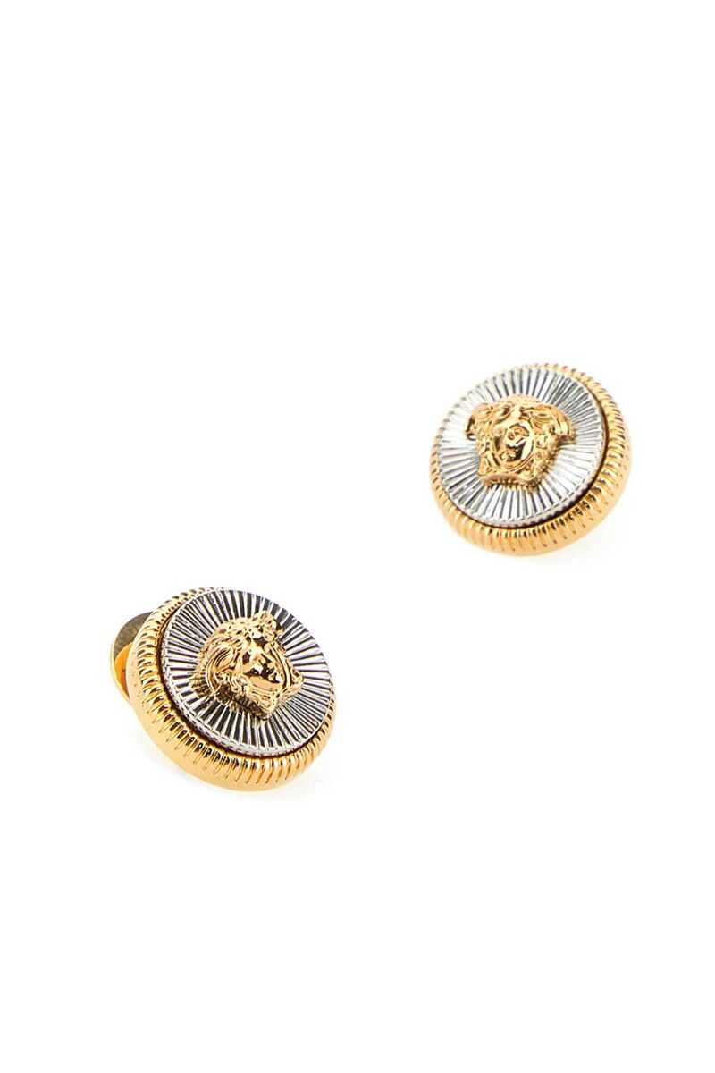 Gold-tone and silver-tone metal Medusa earrings from Versace featuring Medusa Head motif, engraved detail and stud fastening. These earrings come as a pair.