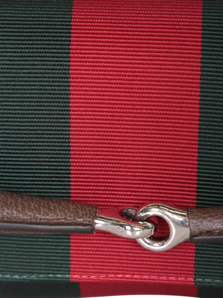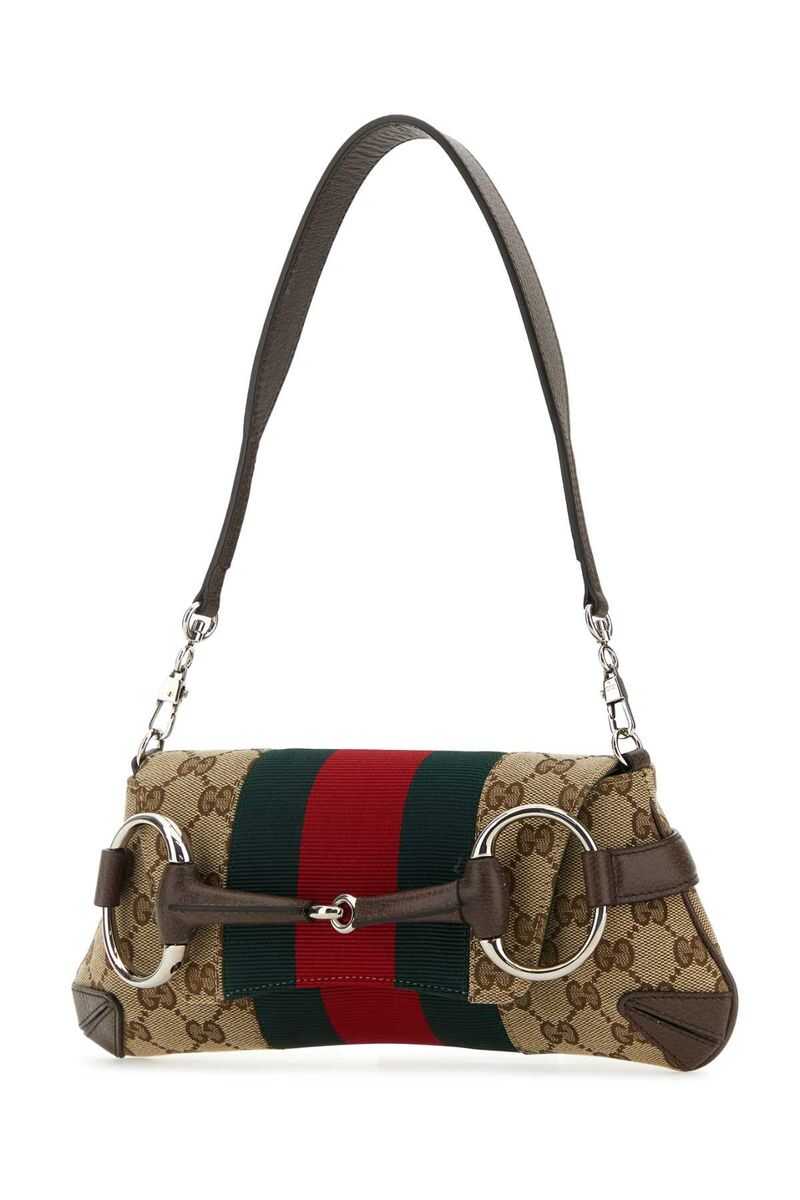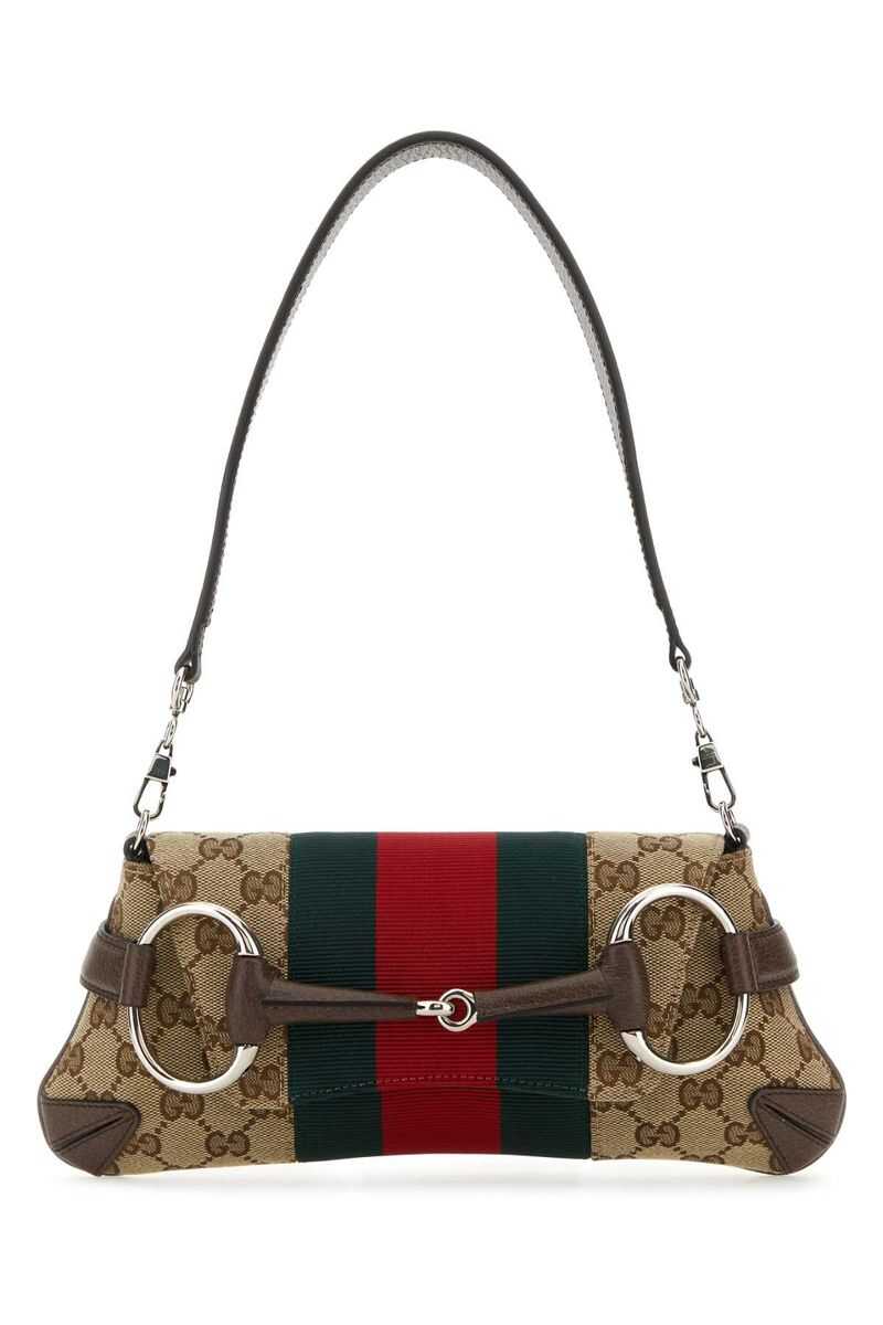 small Horsebit Chain shoulder bag from Gucci featuring archive beige, GG Supreme canvas, leather trim, signature Web-stripe trim, signature Horsebit detail, detachable chain-link shoulder strap, foldover top, main compartment and silver-tone hardware.