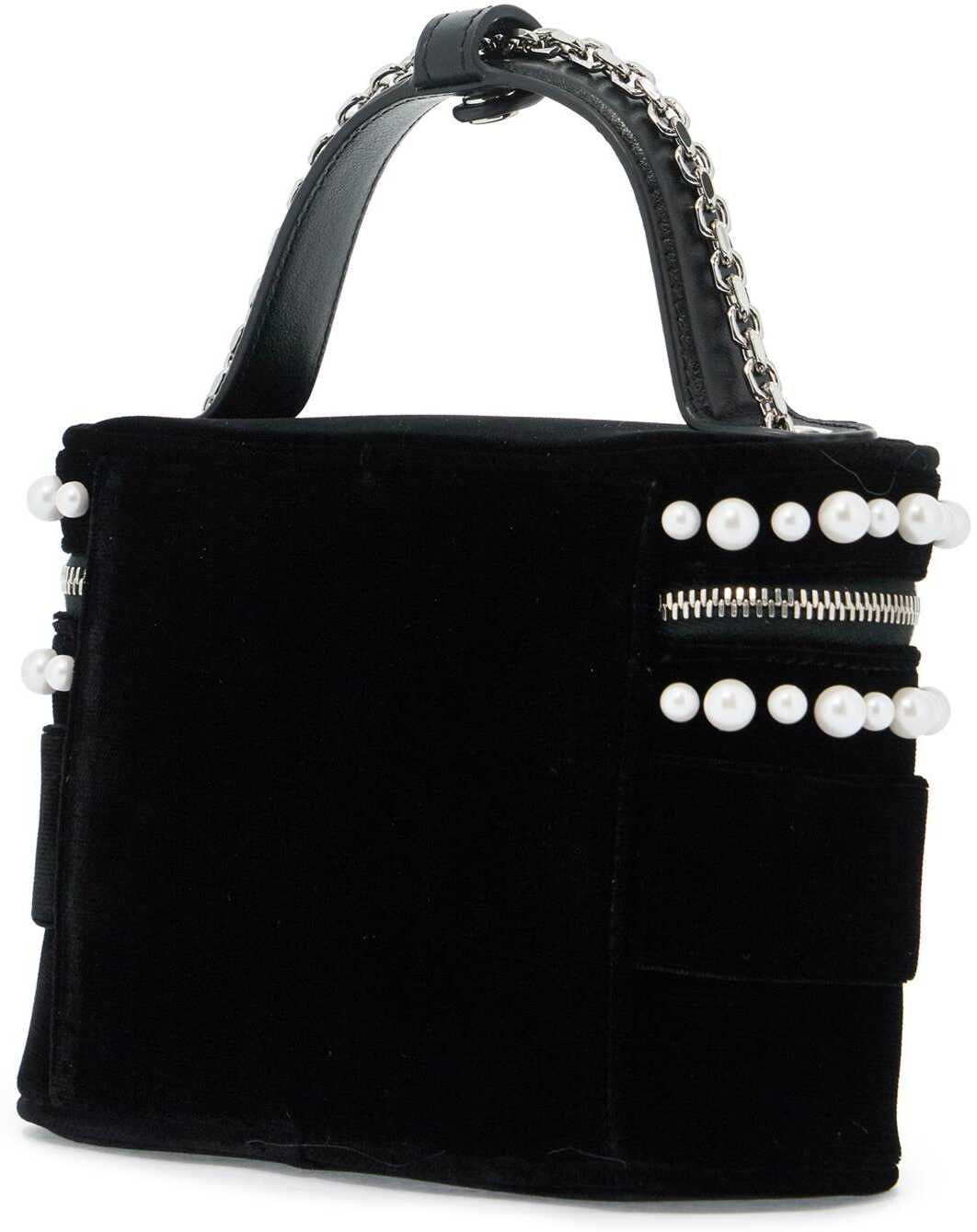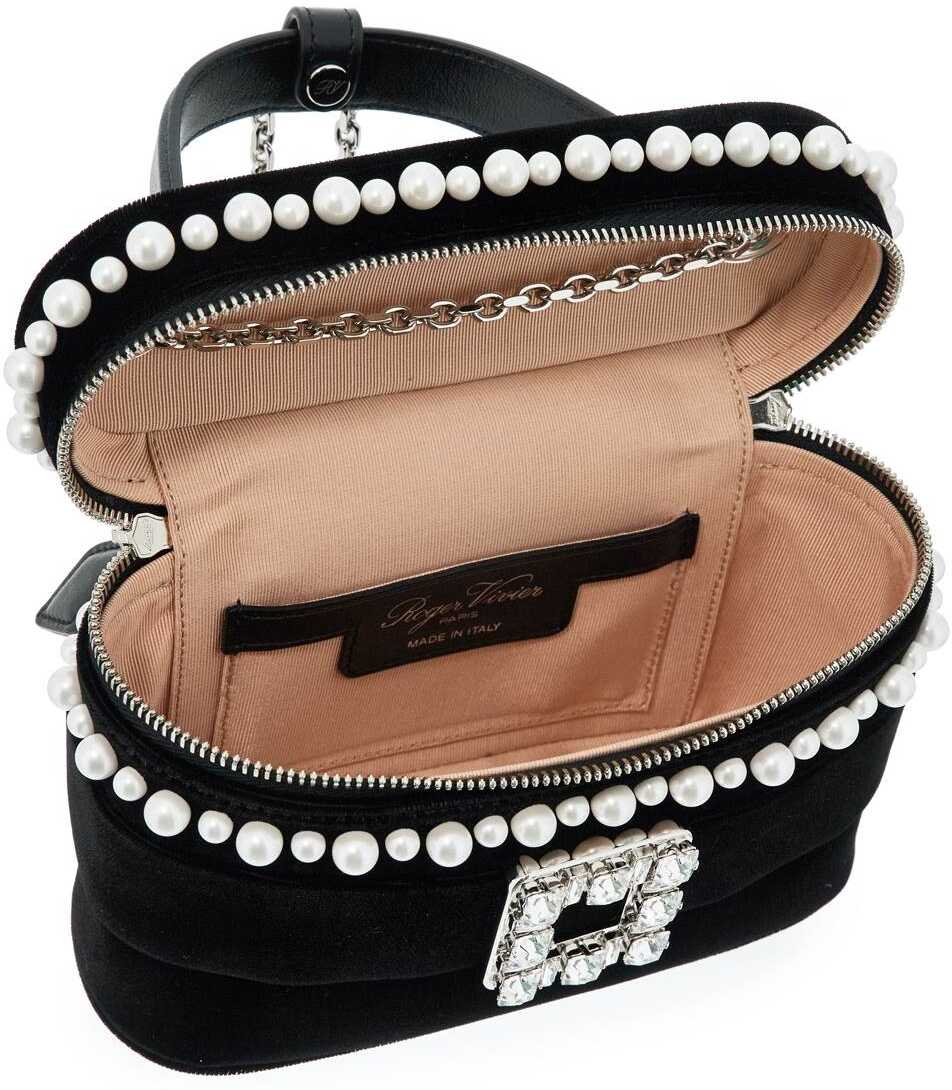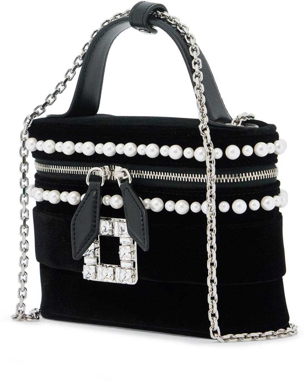 The mini Roger Vivier Vanity Micro bag in velvet is characterized by the "belt" with a jewel buckle made of metal and faceted crystals applied on the front. It has a single handle, a sliding chain shoulder strap, and a zip closure. The interior is lined with contrasting grosgrain fabric and features a pocket, while the accessories are made of silver metal.