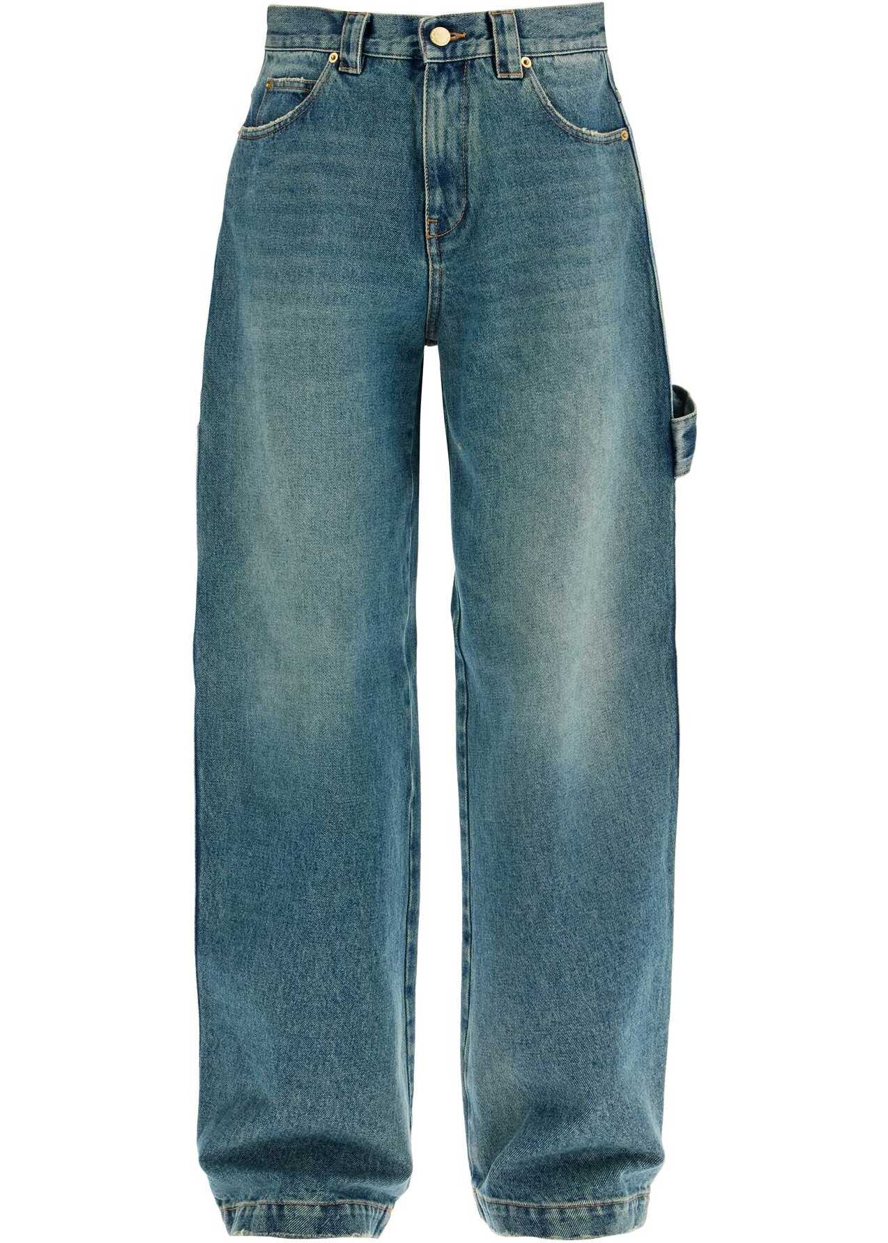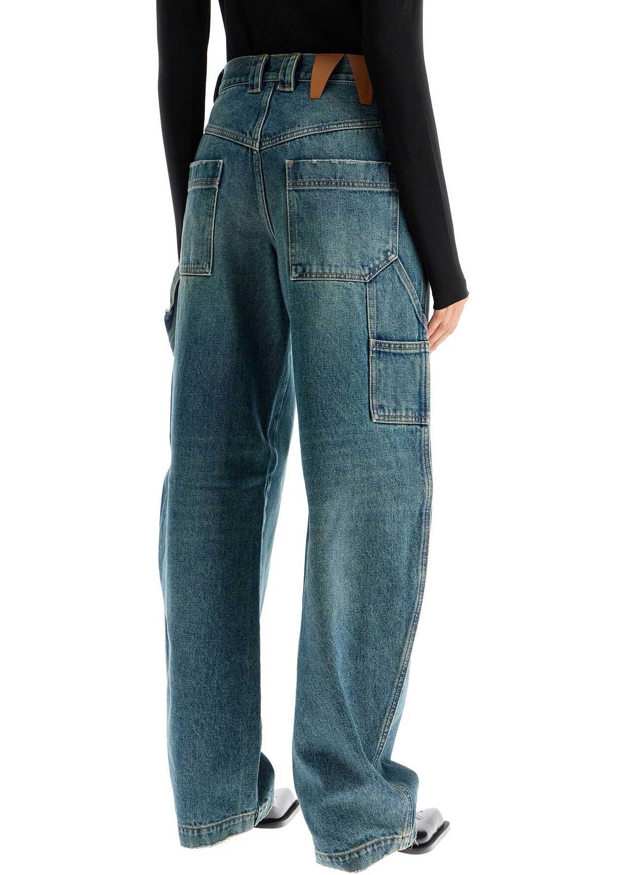 DarkPark carpenter jeans made of distressed denim with a high-waisted barrel silhouette. The five-pocket construction is enriched with utility details, belt loops and zip and button closure. The model is 177 cm tall and wears size 26.