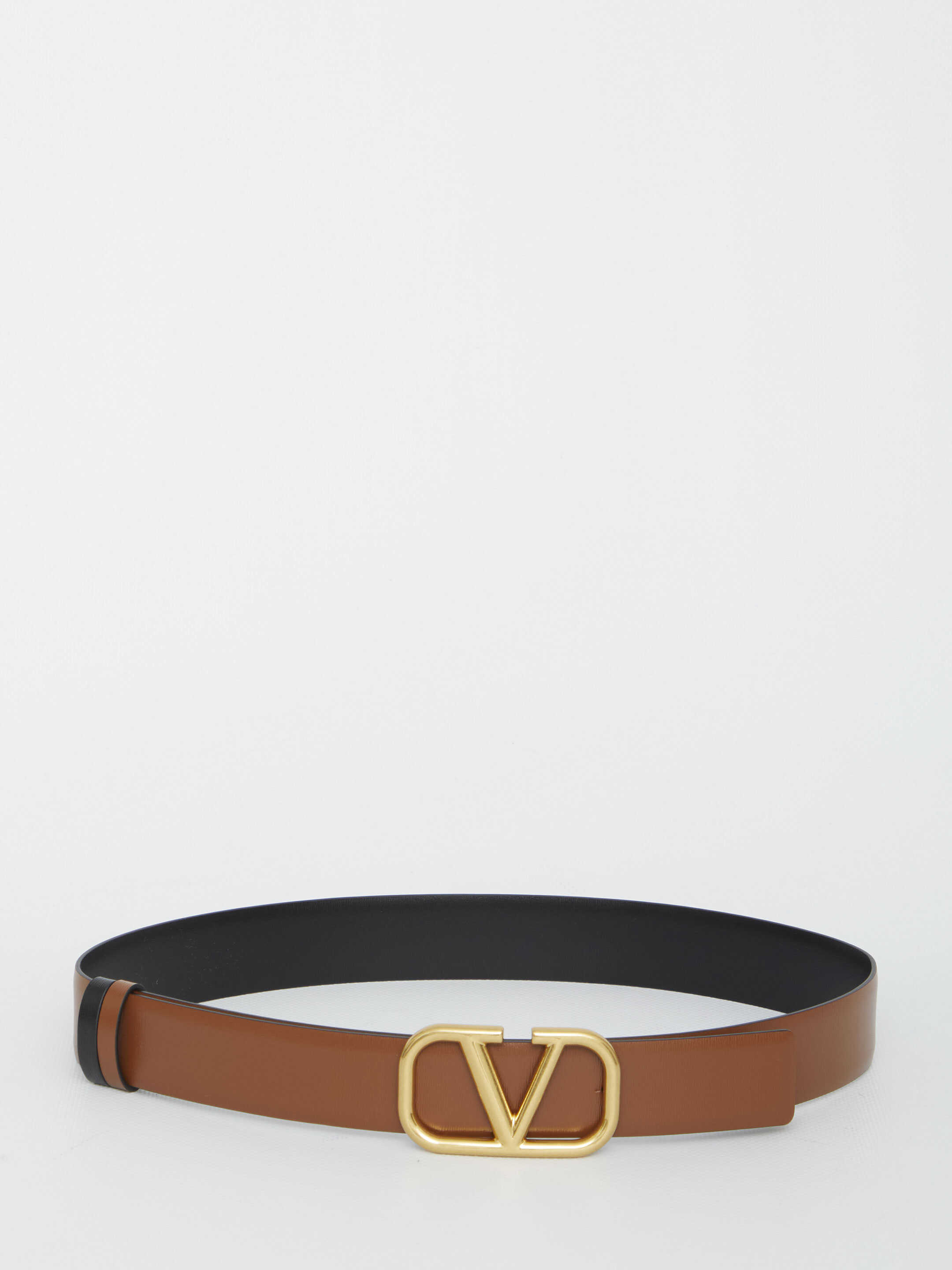 Reversible belt crafted from calfskin, black on one side and brown on the other. Gold-tone metal VLogo Signature buckle. Adjustable design. Any leather imperfections are not to be considered manufacturing defects, but a peculiarity of the material.