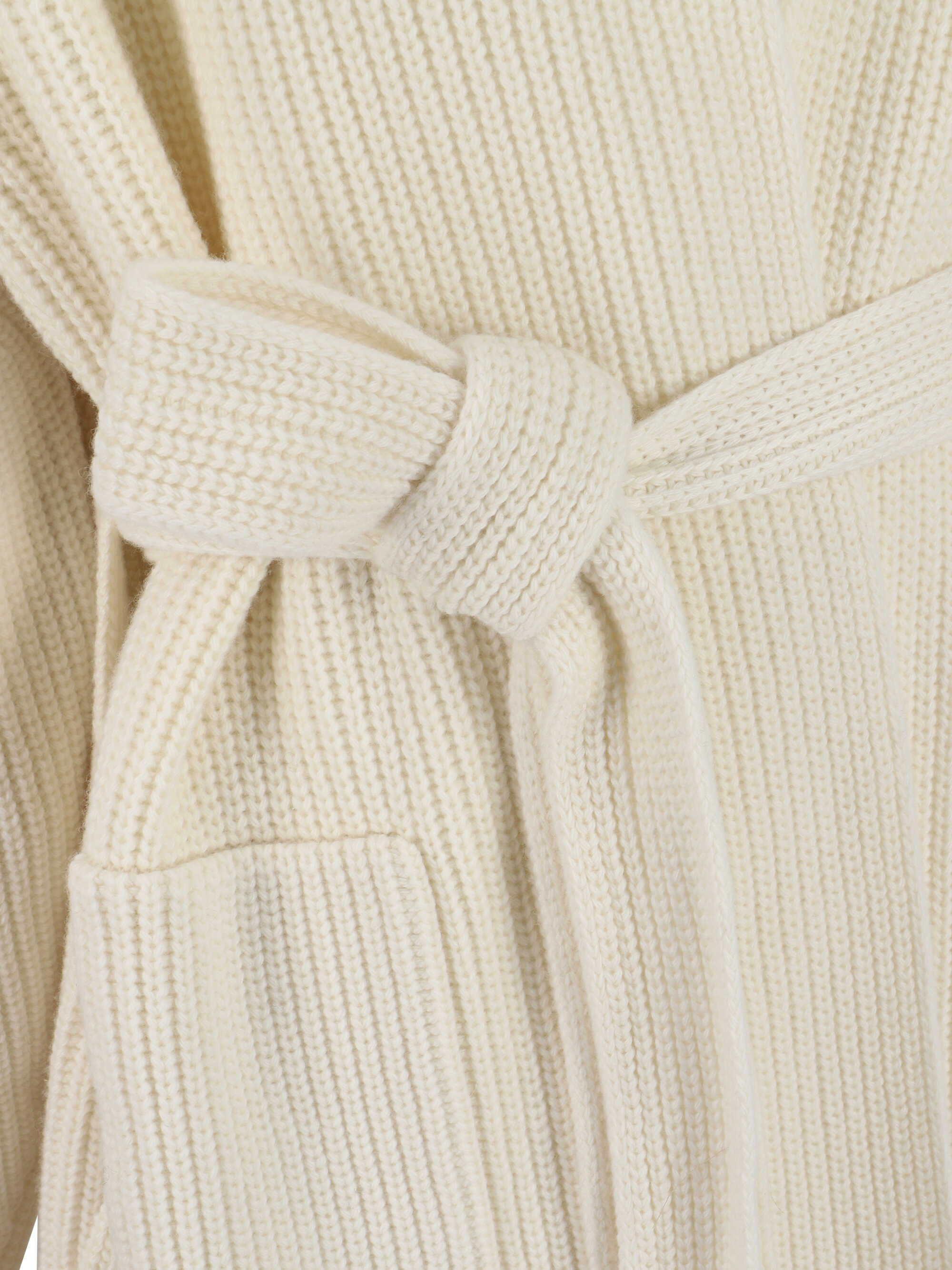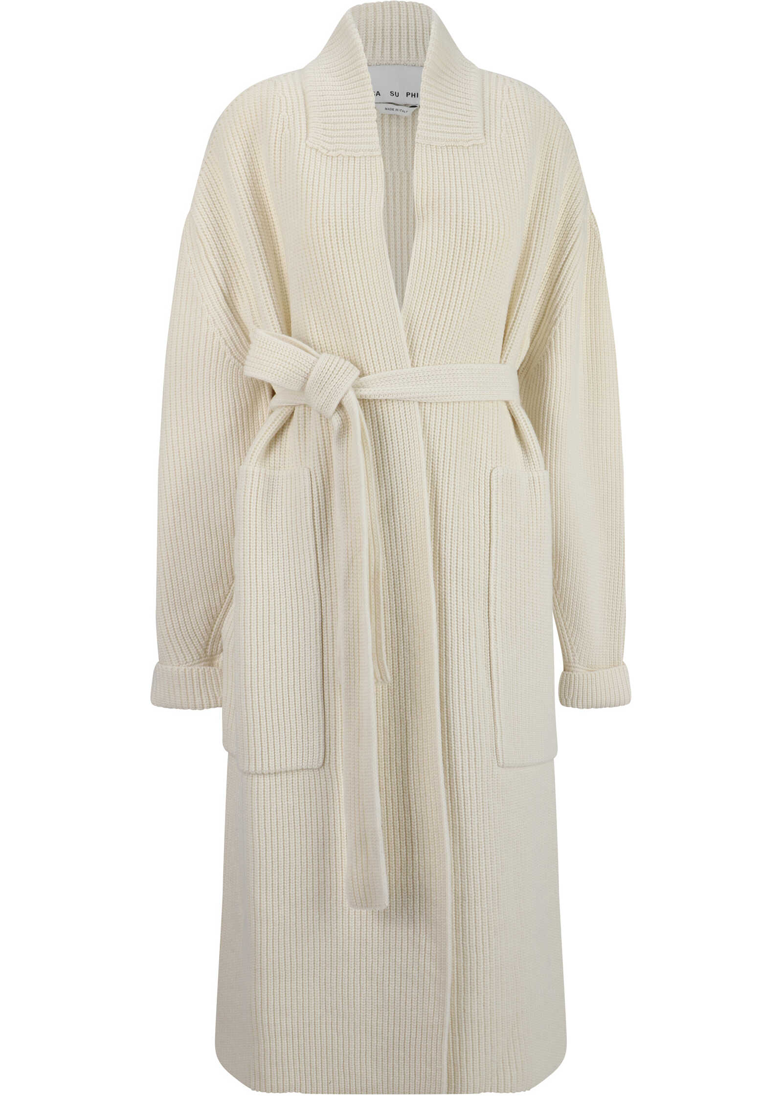 Merino Wool E.r. Long Coat Cardigan by Sa Su Phi, removable matching knotted sash waistband, two welt patch pockets on front, foot-length, over fit.