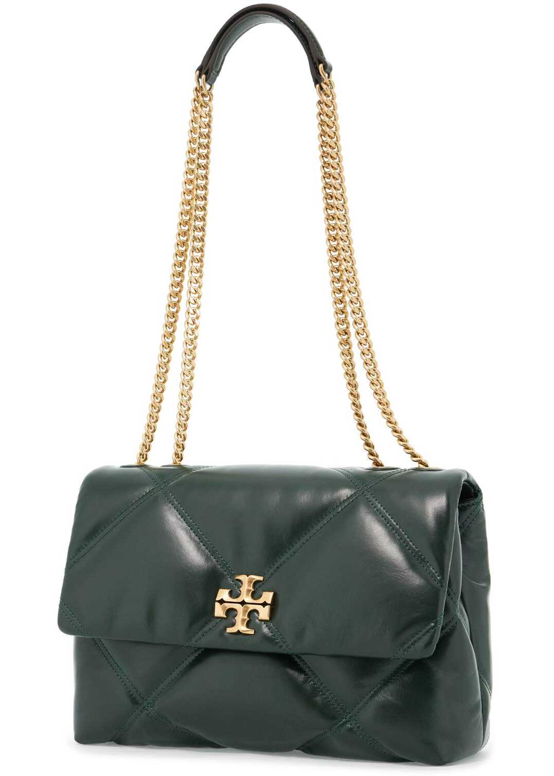 The Kira shoulder bag by Tory Burch is made of quilted nappa leather with a diamond pattern. The flap has a magnetic closure and is adorned with the iconic double T metal logo on the front. The interior is lined in fabric and features two compartments divided by a zip pocket, two open pockets, and an additional zip pocket. The design can be converted thanks to the chain strap that can be doubled for a shoulder look.