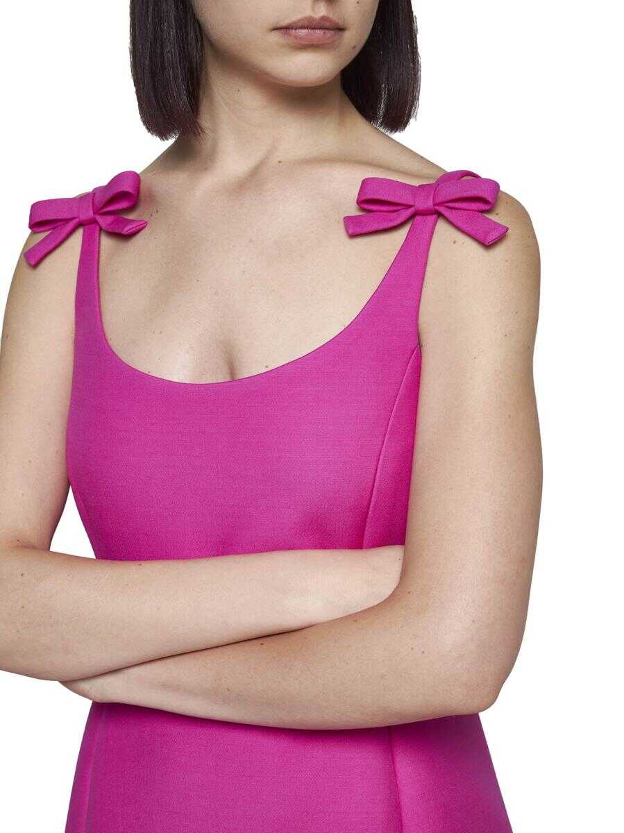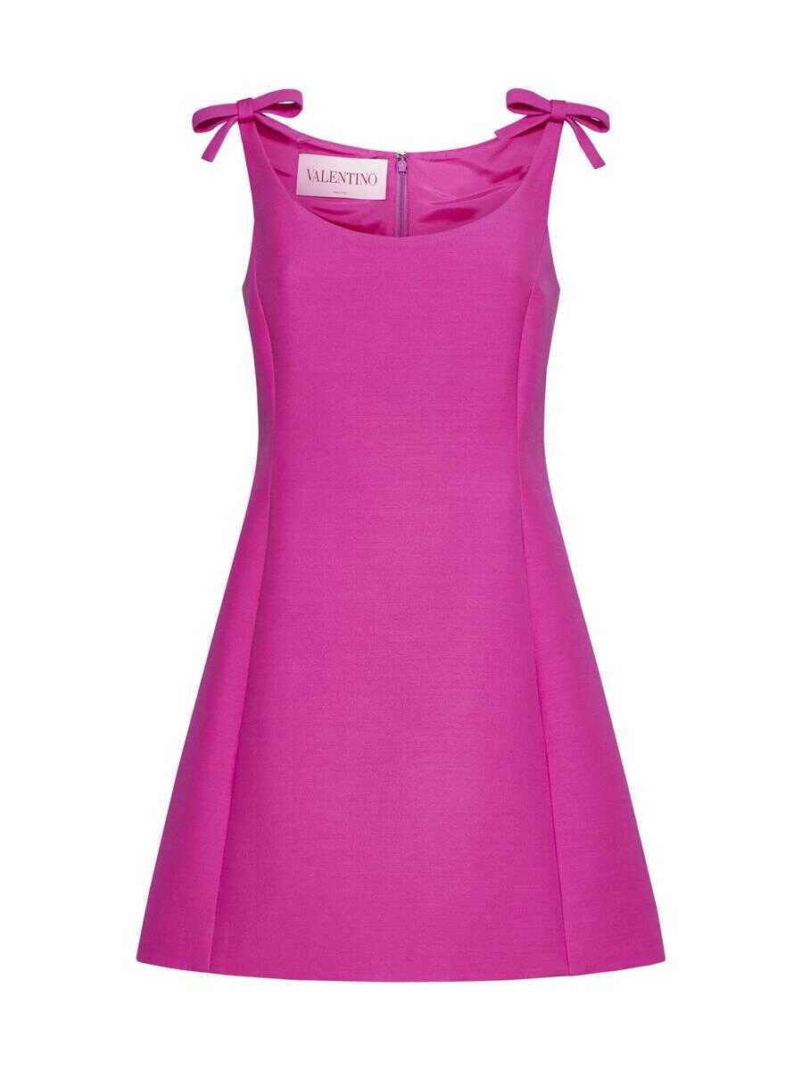 Valentino’s pink wool and silk mini dress featuring a scoop neck, thin straps with decorative bows, a fitted silhouette slightly flared at the bottom and a zip fastening at center back. The model is wearing shoes and accessories from Valentino Garavani.
