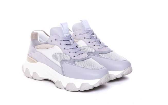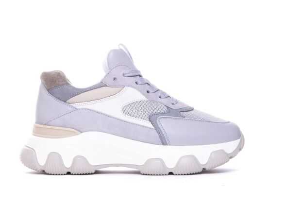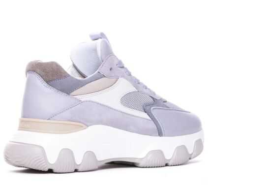 cool grey/beige/white calf leather/suede panels/micro-mesh panels front lace-up fastening contrasting heel counter logo-print pull-tab at the tongue round toe branded insole oversize rubber sole