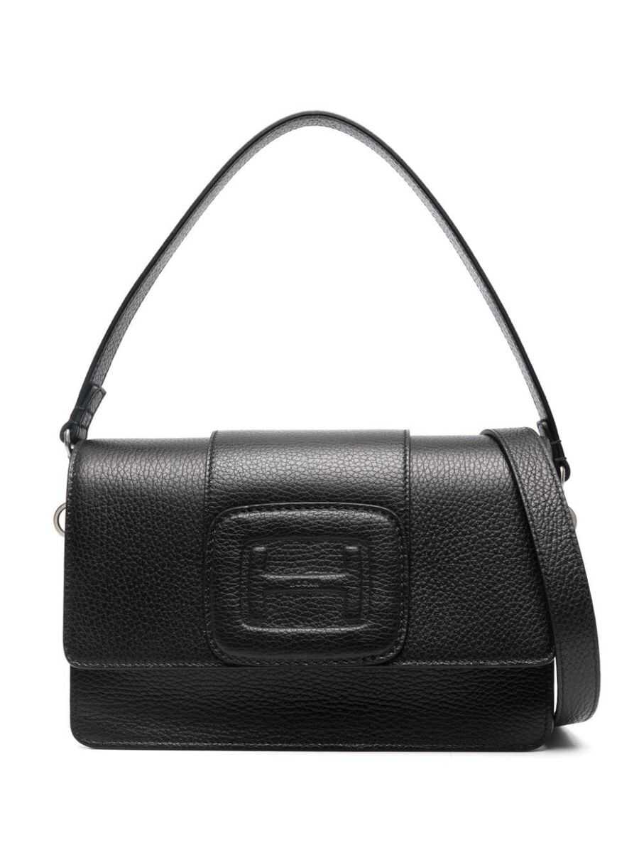 black calf leather pebbled texture debossed logo to the front foldover top single detachable top handle adjustable detachable shoulder strap partitioned compartment internal patch pockets debossed internal logo full lining gold-tone hardware concealed magnetic fastening This piece comes complete with a protective dust bag.