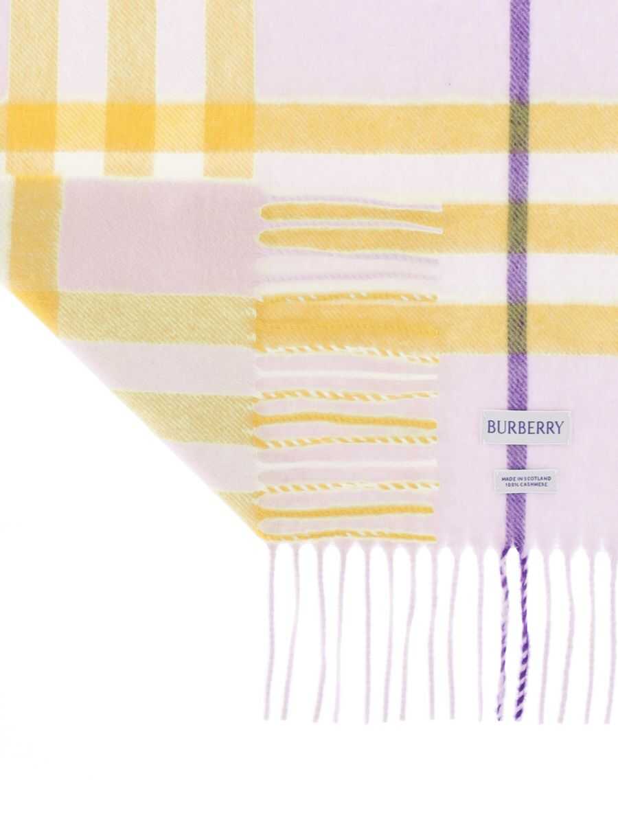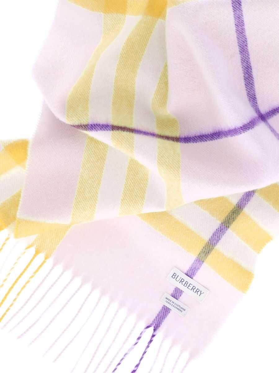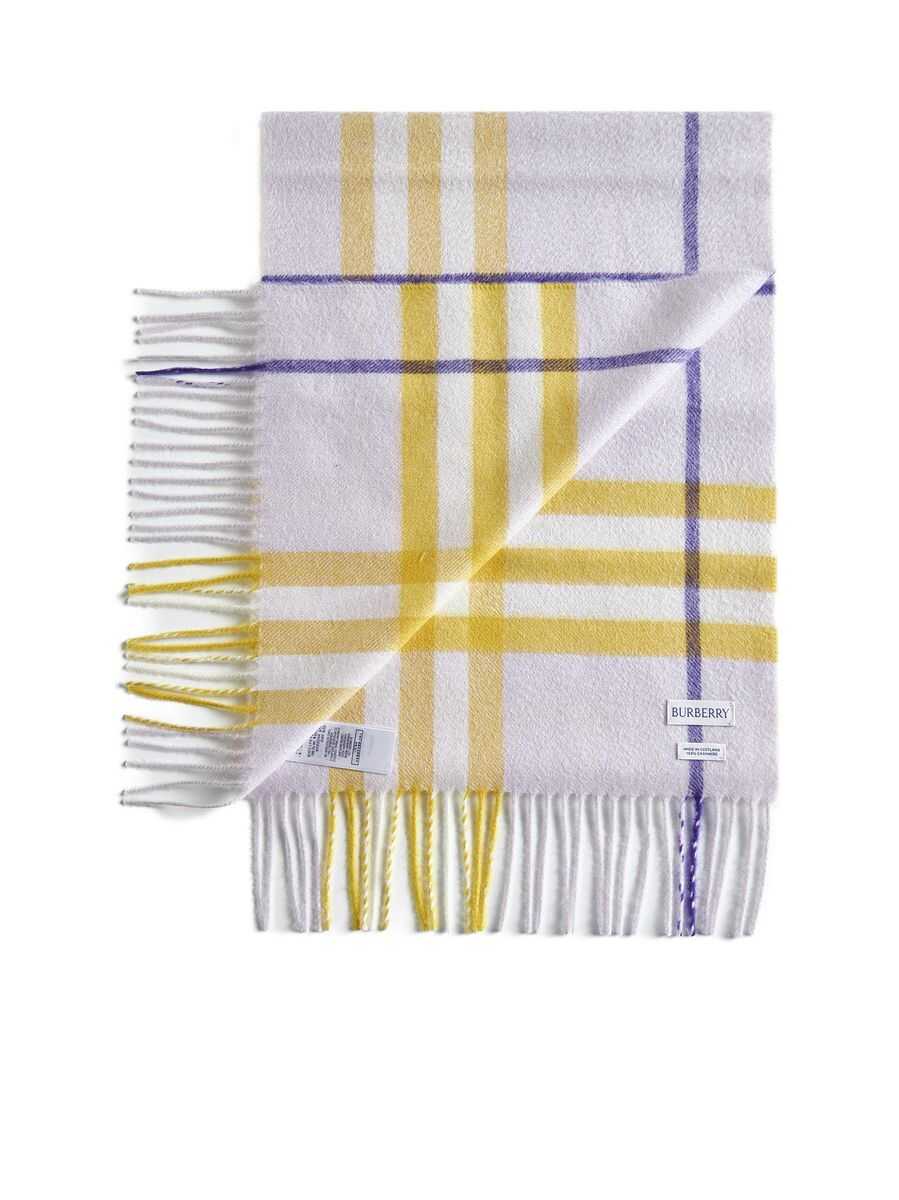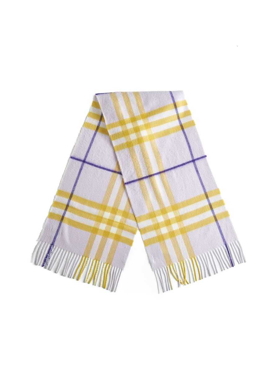 checked fringed-edge cashmere scarf from BURBERRY featuring sunflower yellow, lilac purple, cashmere, check pattern, logo patch to the front, rectangle shape, wraparound style and fringed edge. Length: 168.0 Centimetres