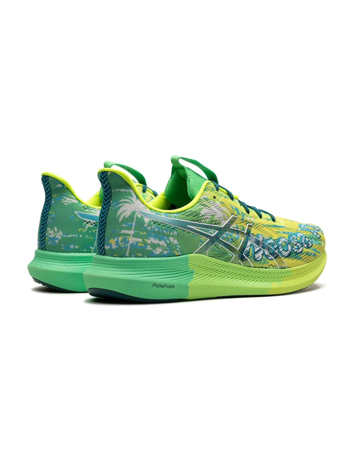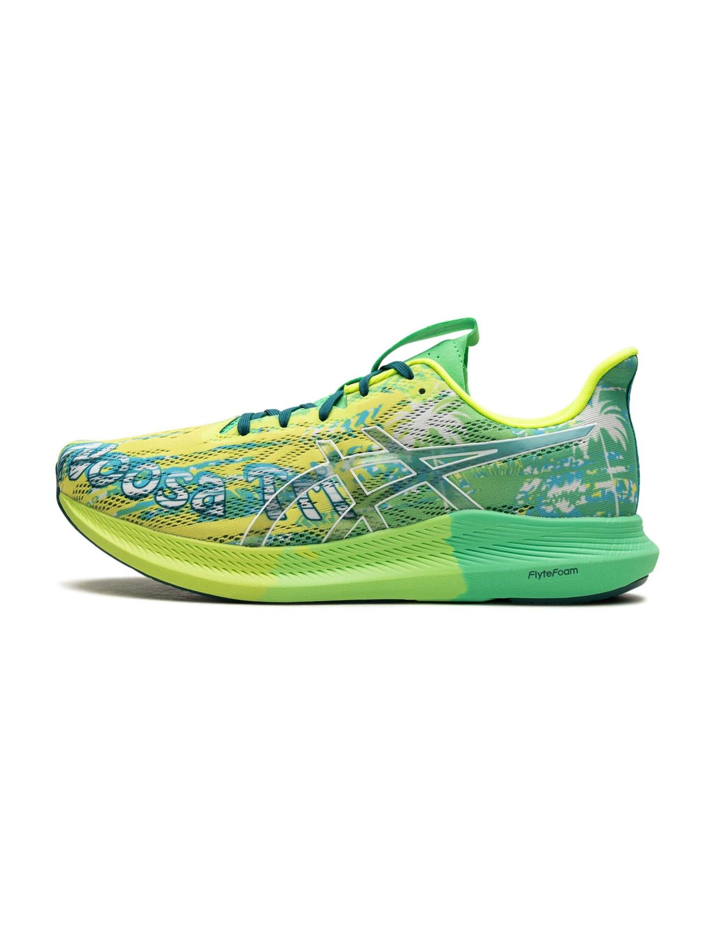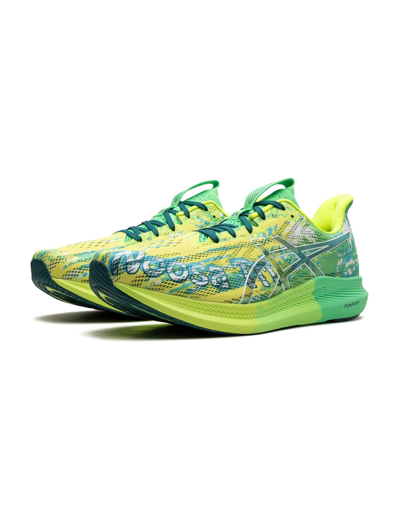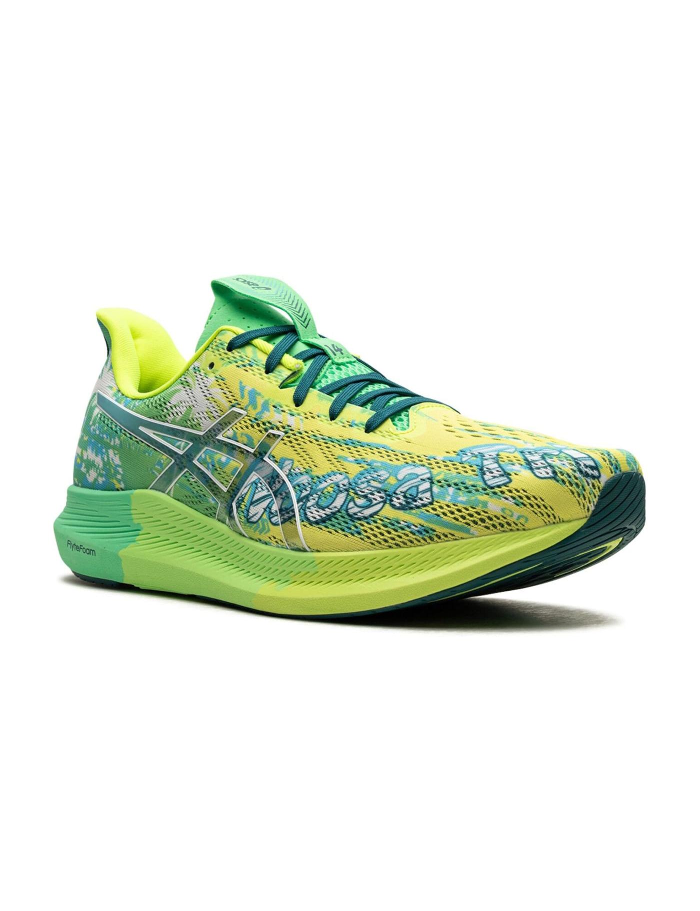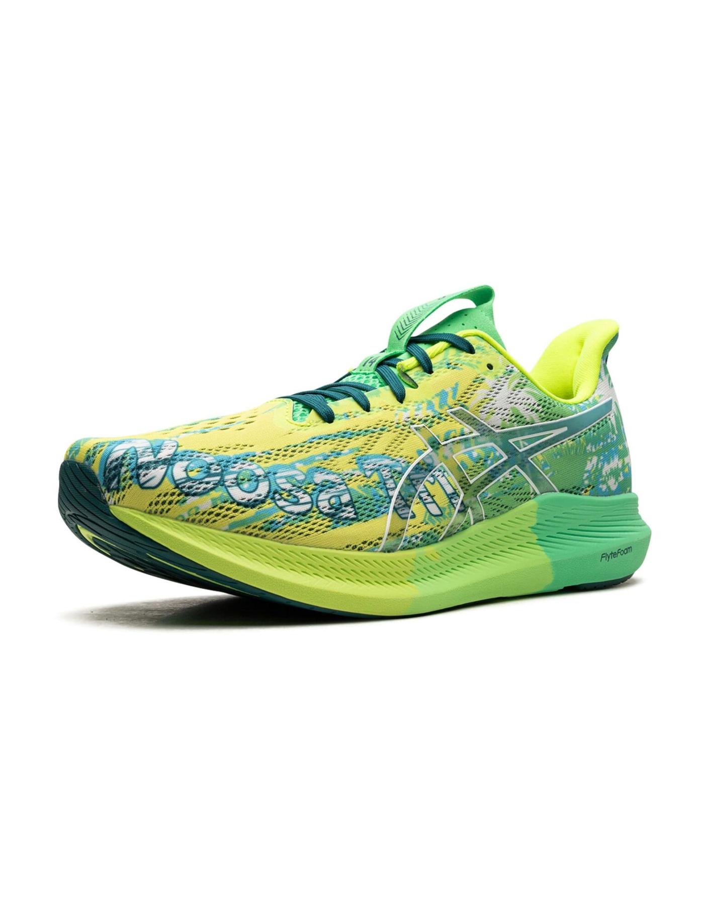 The ASICS Noosa Tri 14 "Safety Yellow Green" sneakers are popular among runners and athletes. Besides the eye-catching design in green and yellow hues, this model features a breathable mesh upper with synthetic overlays for added support and durability. Underneath, the Flytefoam midsole provides cushioning and a responsive ride, while the outsole offers excellent traction on various surfaces.