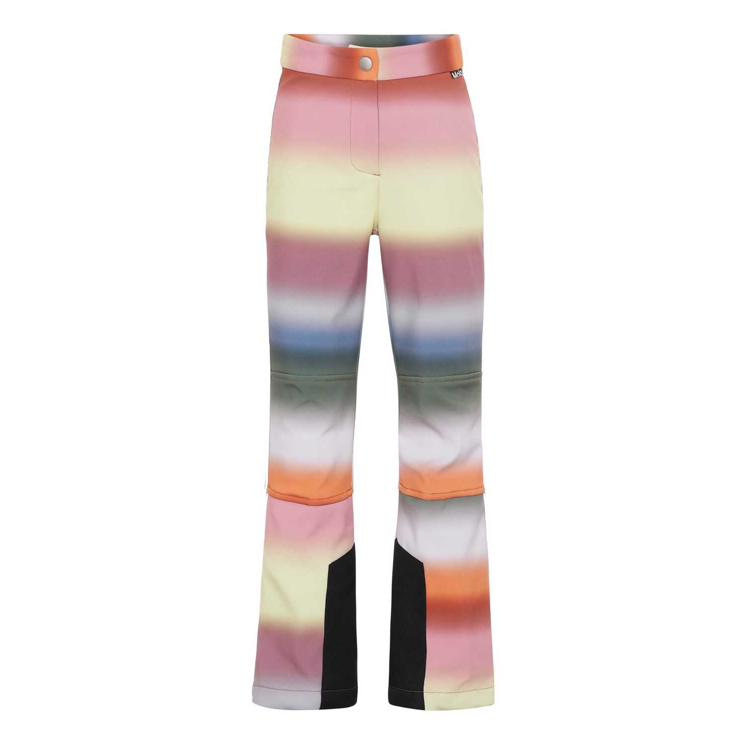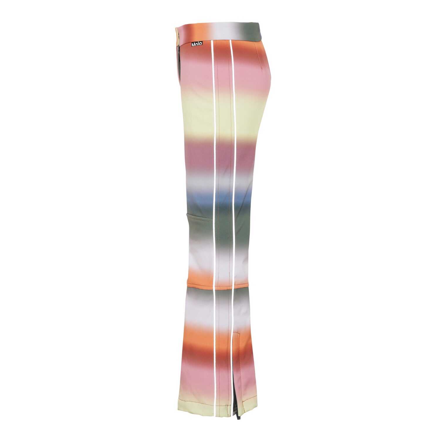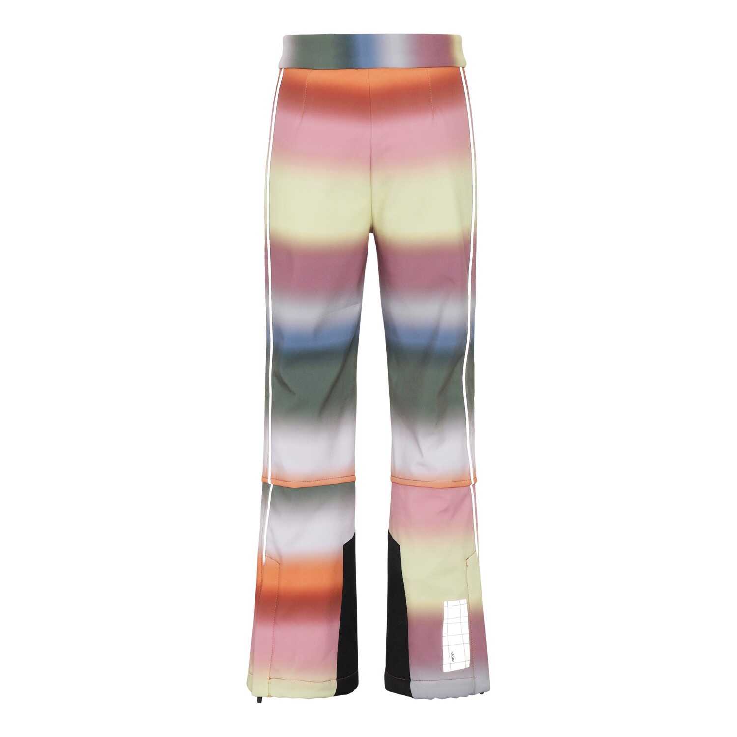 Snow pants, multicolor striped design, recycled fabric, reflective and contrasting details