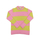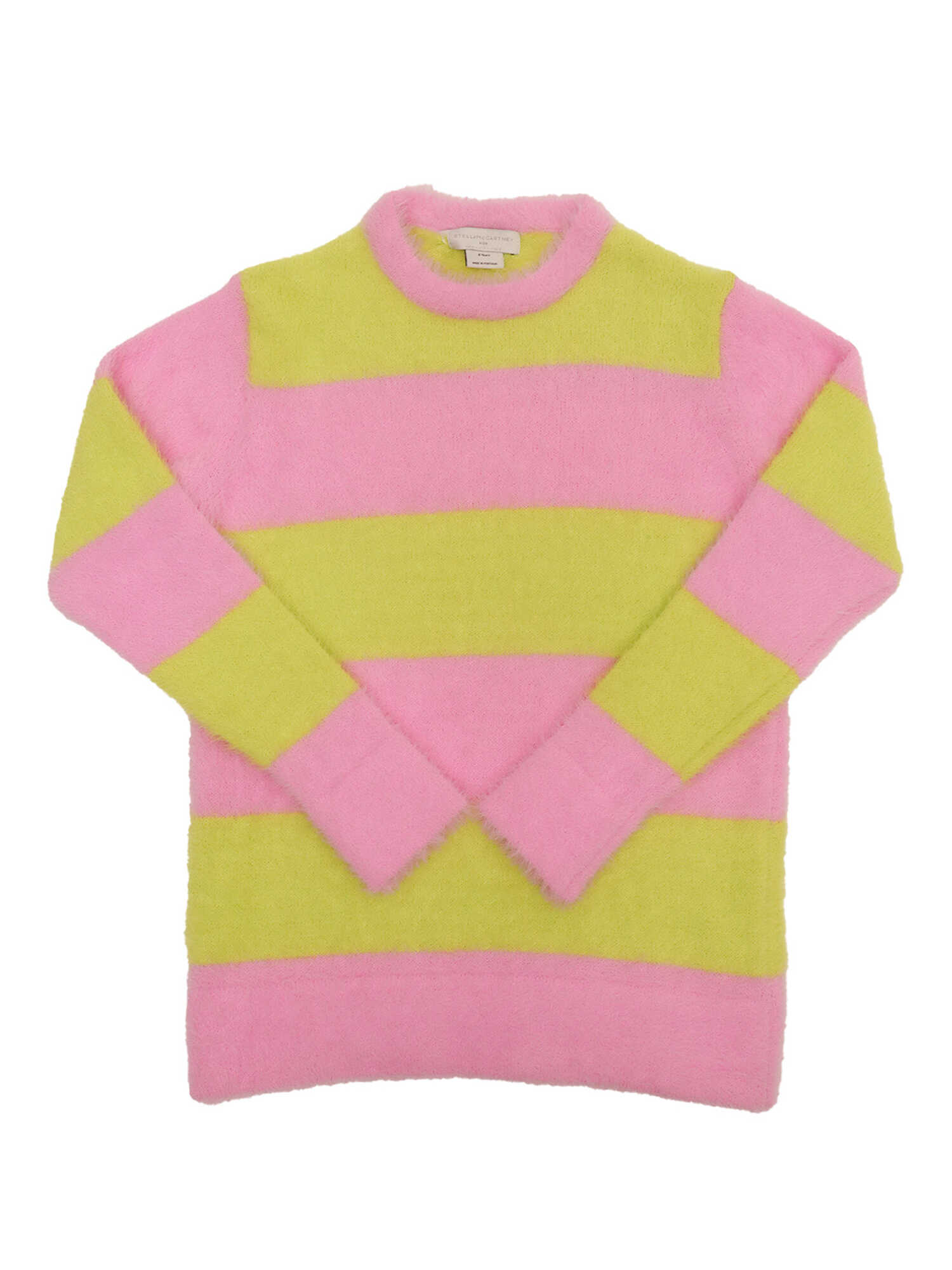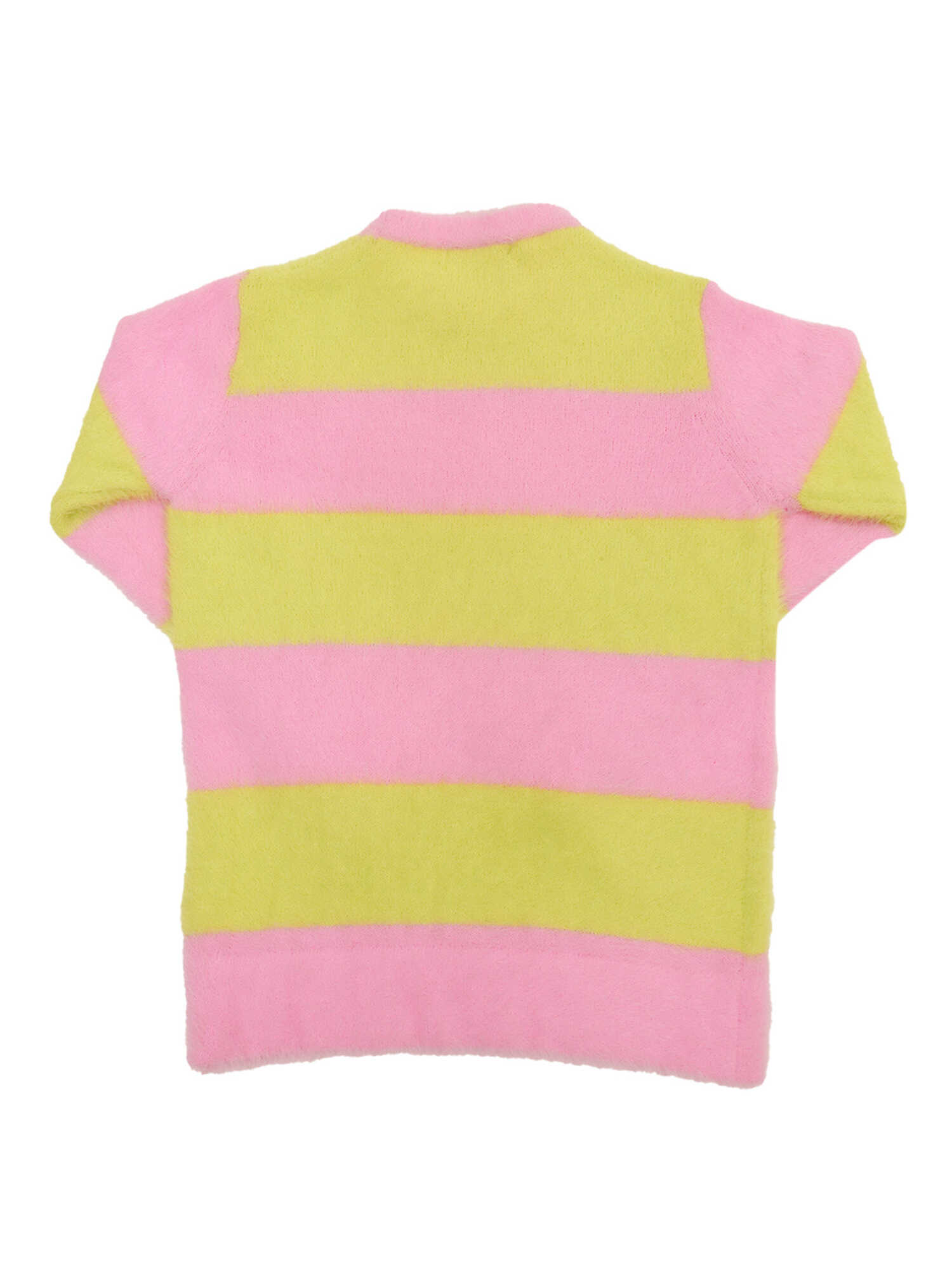 Yellow and pink color block sweater, horizontal striped pattern, round neck, straight hem