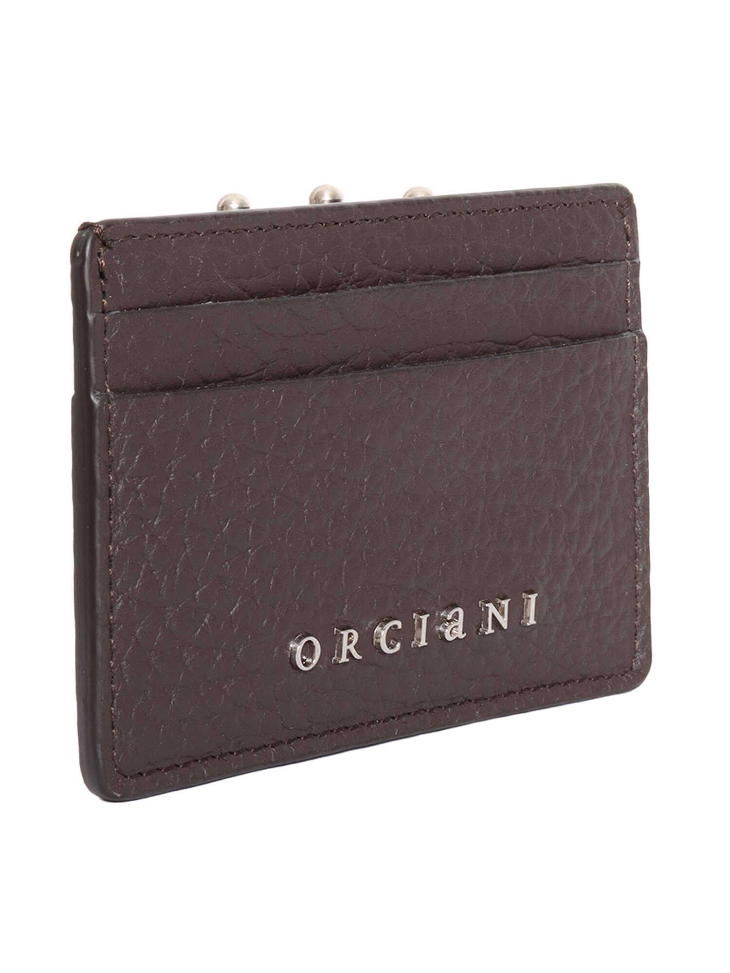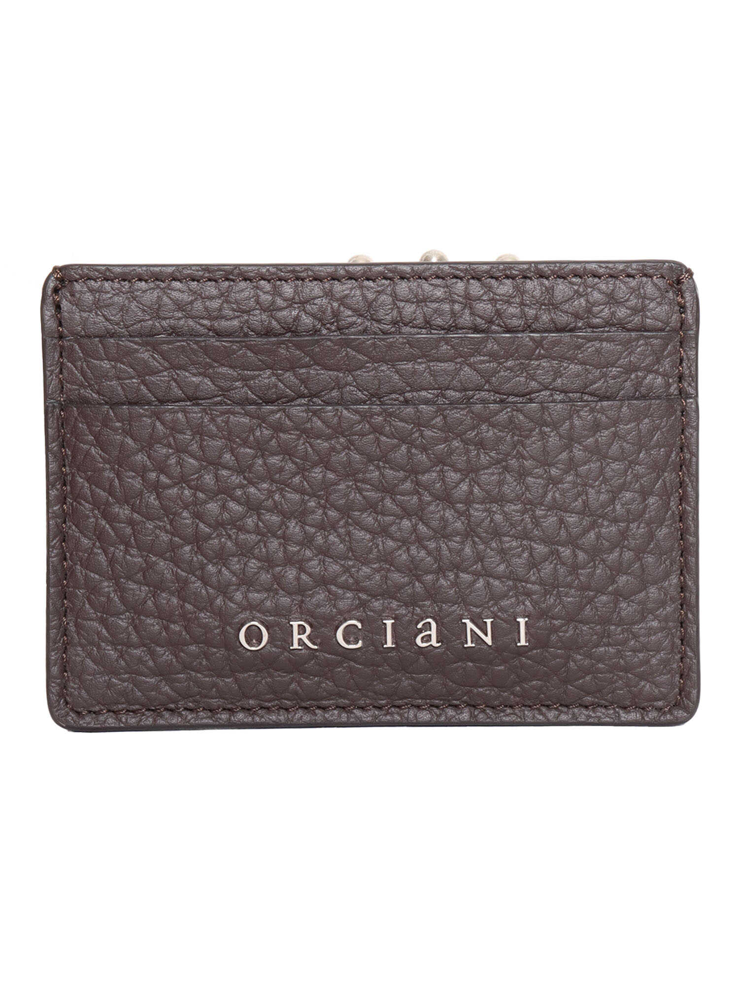 Dark brown card holder in textured leather, metal logo detail, 6 slots
