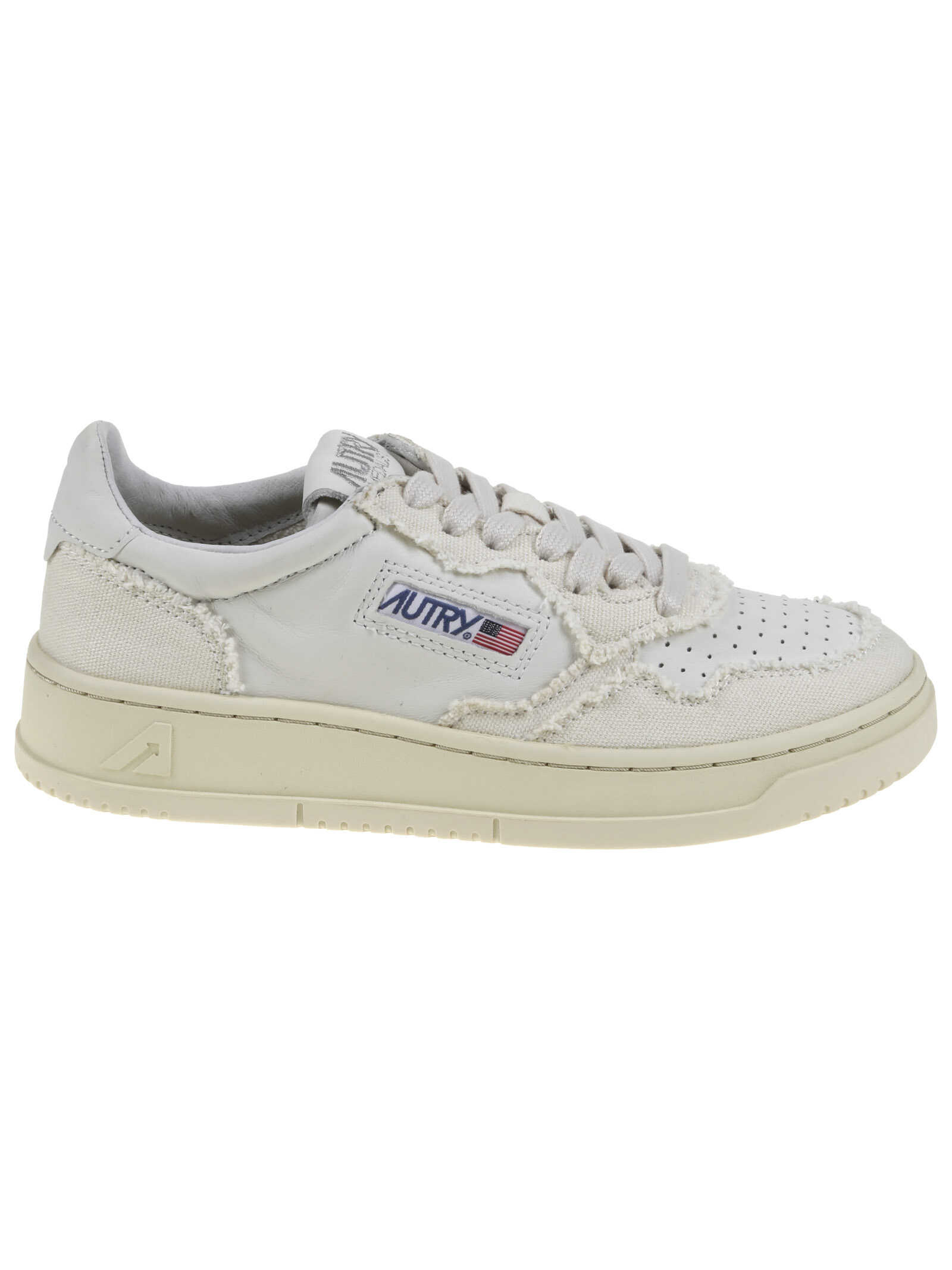 AUTRY sneakers with soft goat leather and ivory canvas upper with stitching, perforated toe for breathability, flat cotton laces, fabric tongue with tonal sewn label. Padded collar. Iconic ivory heel tab on the back with embossed logo.