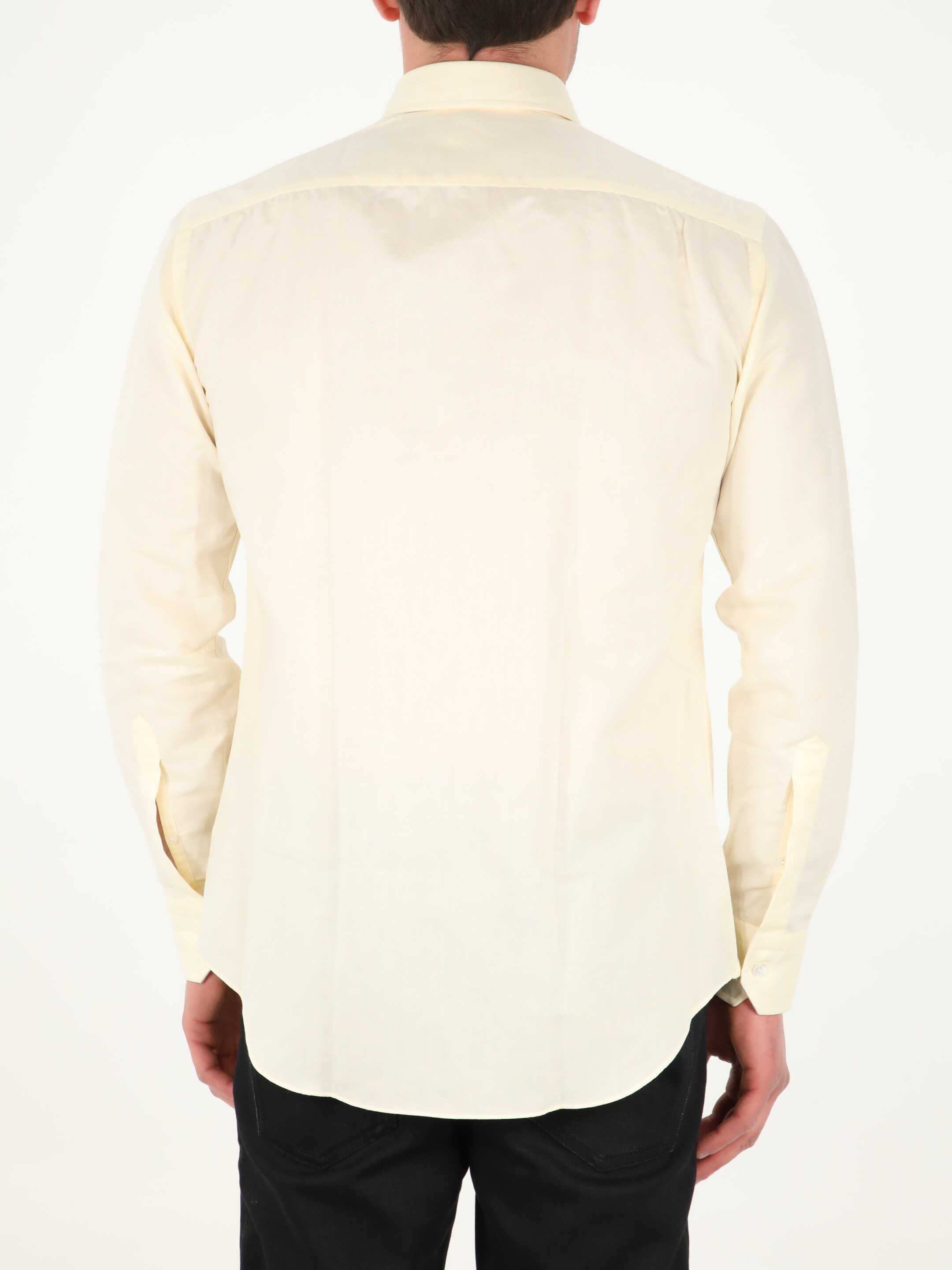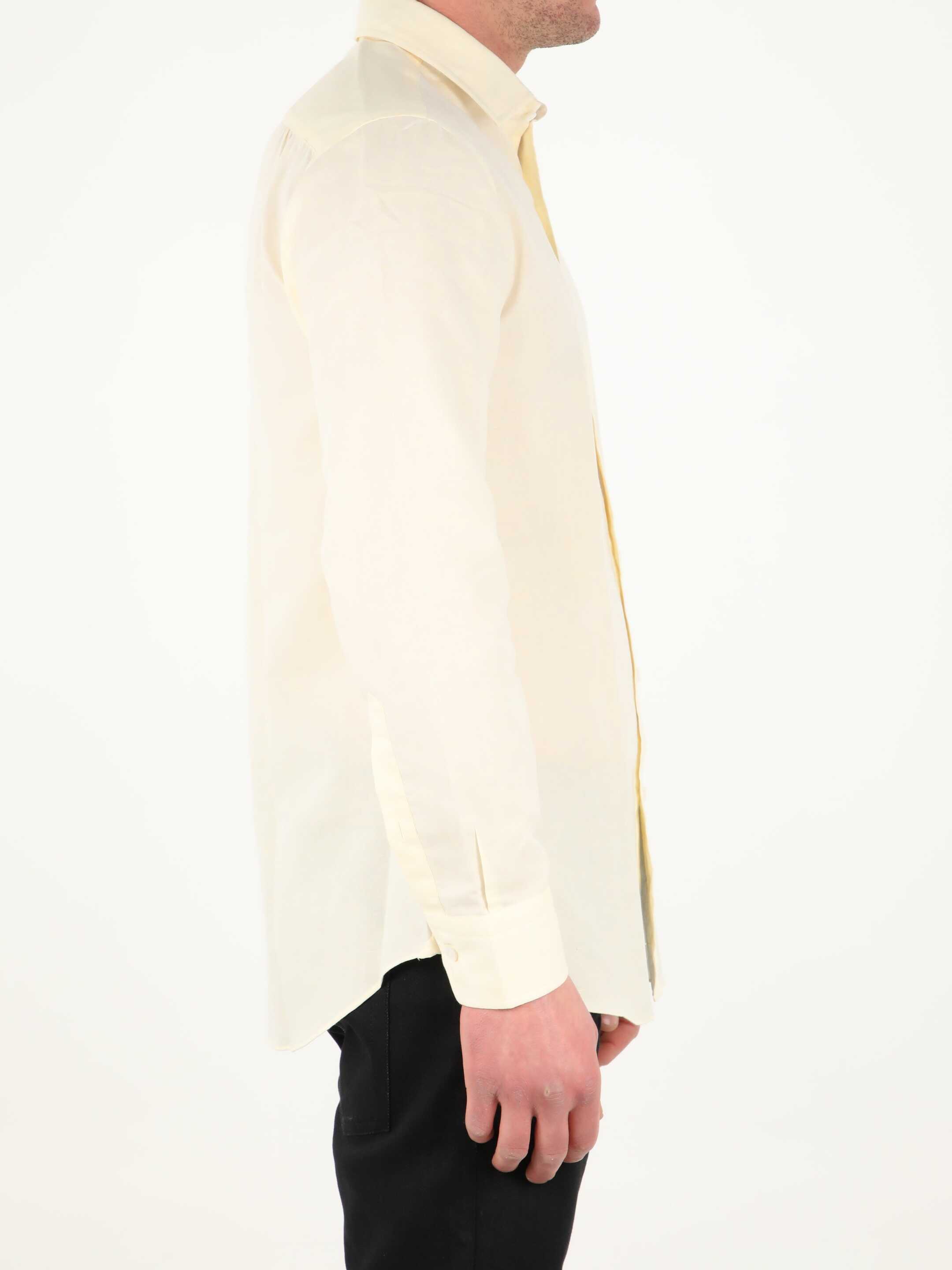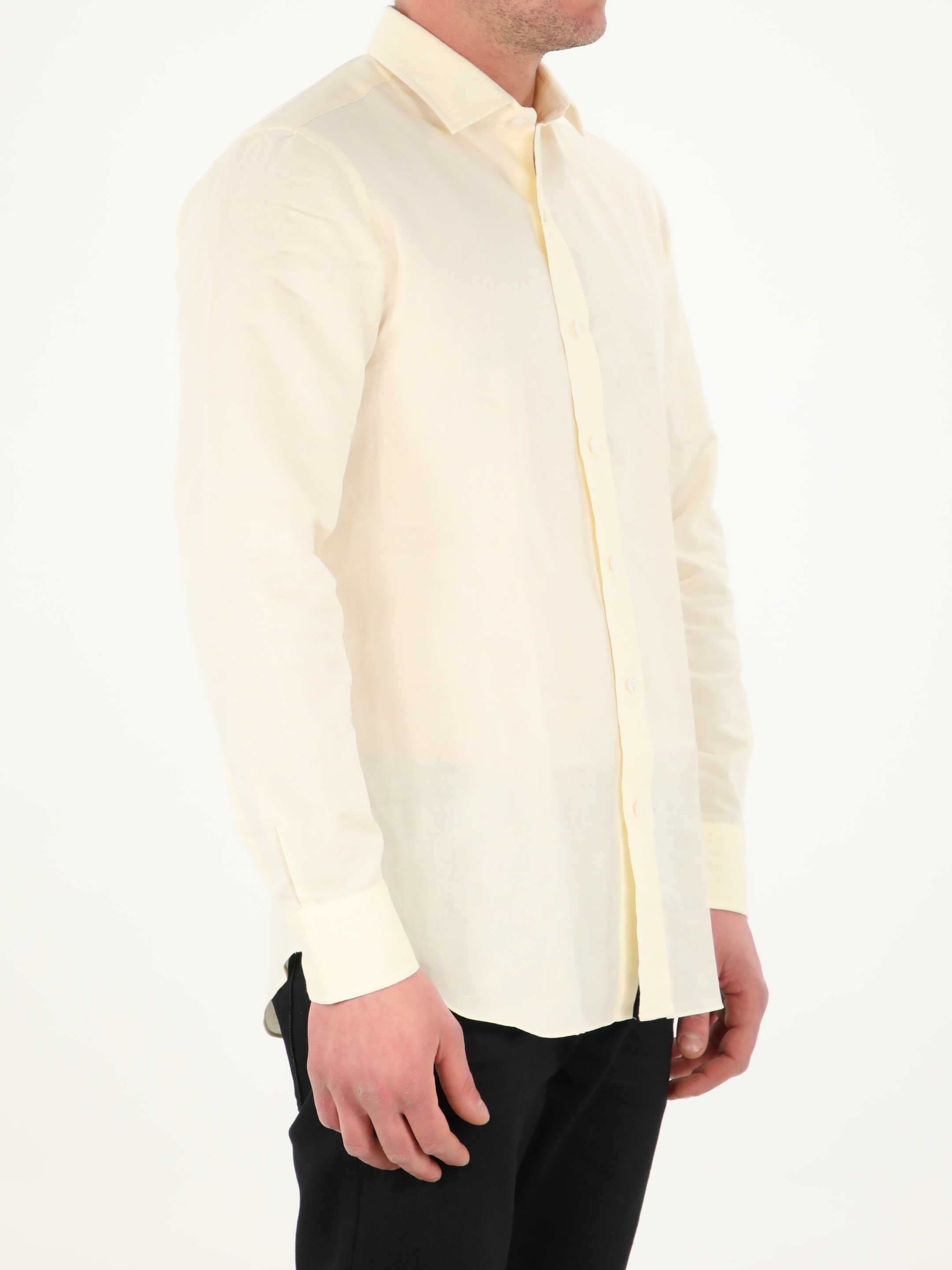 Long-sleeved shirt in yellow cotton linen blend. It features classic collar, front button closure and buttoned cuffs.