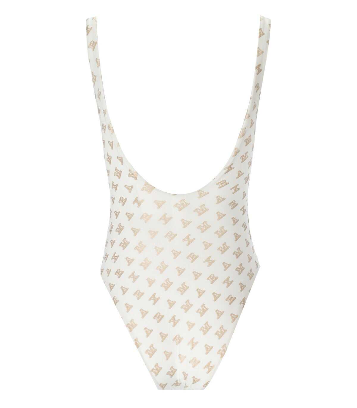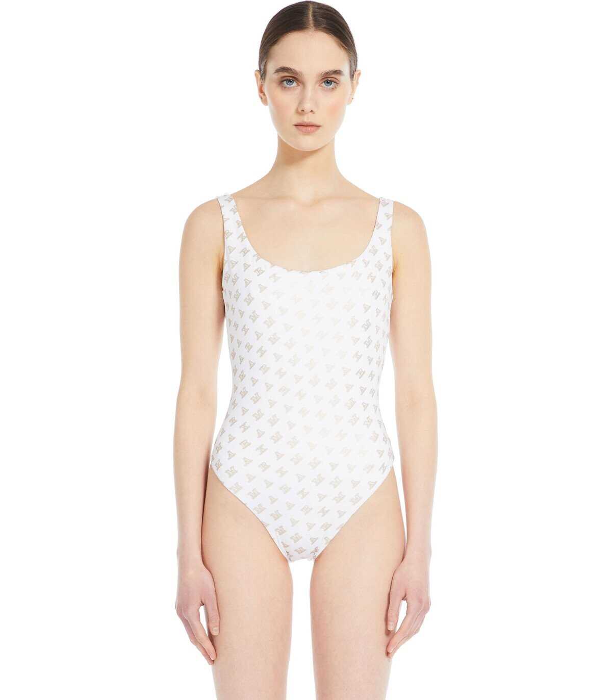 Clarice swimsuit by Max Mara Beachwear made of white Lycra® jersey, decorated with monogram print in gold tones. Wide back neck.