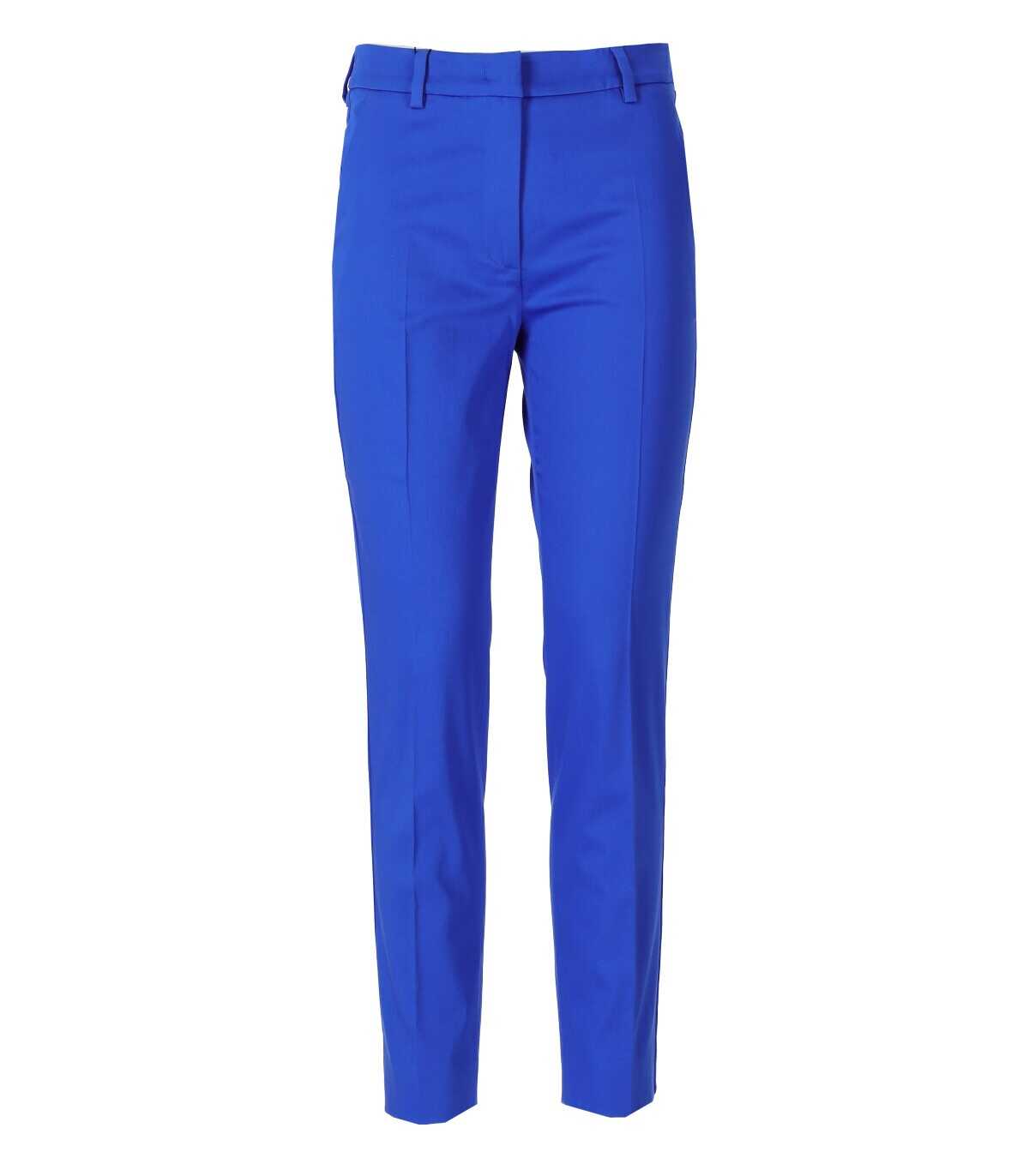 Gineceo pants by Max Mara Weekend made of electric blue stretch cotton satin, with slant pockets on the front and welt pockets on the back. Central ironing, zip closure and metal hook.