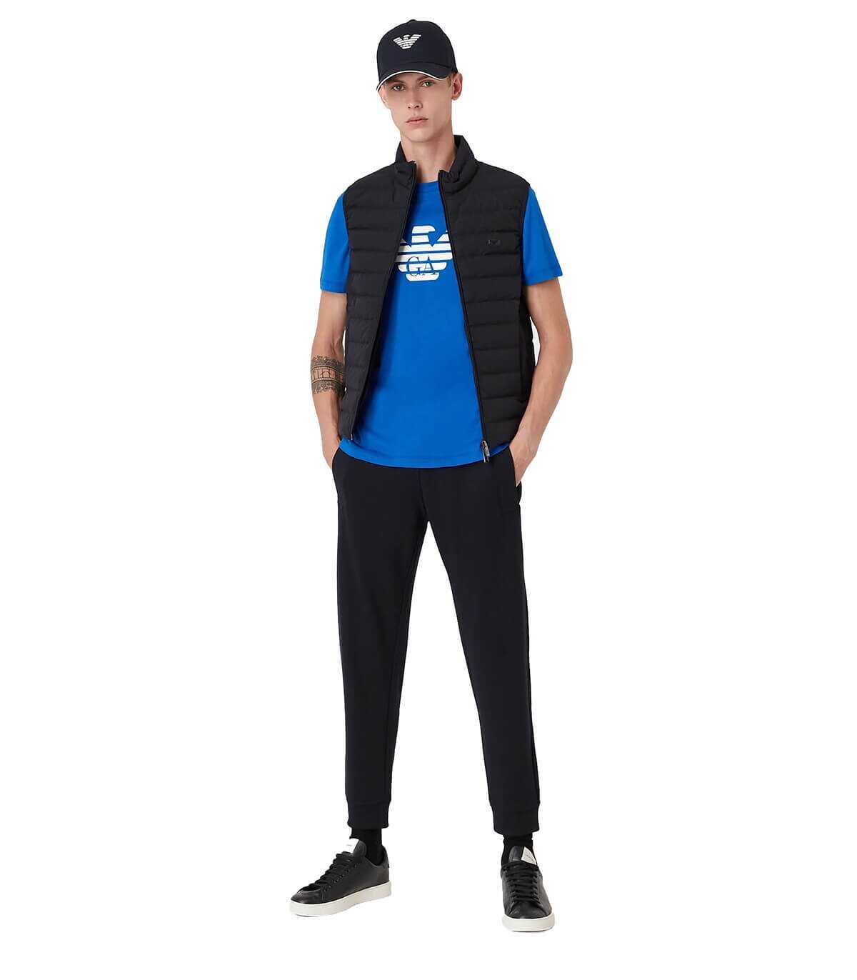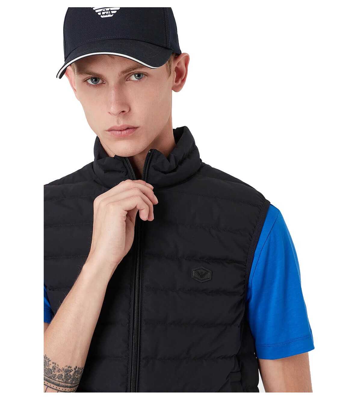 Quilted vest by Emporio Armani made of navy blue nylon with duck down padding. Welt pockets on the front, metal logo patch and double-slider zip closure.