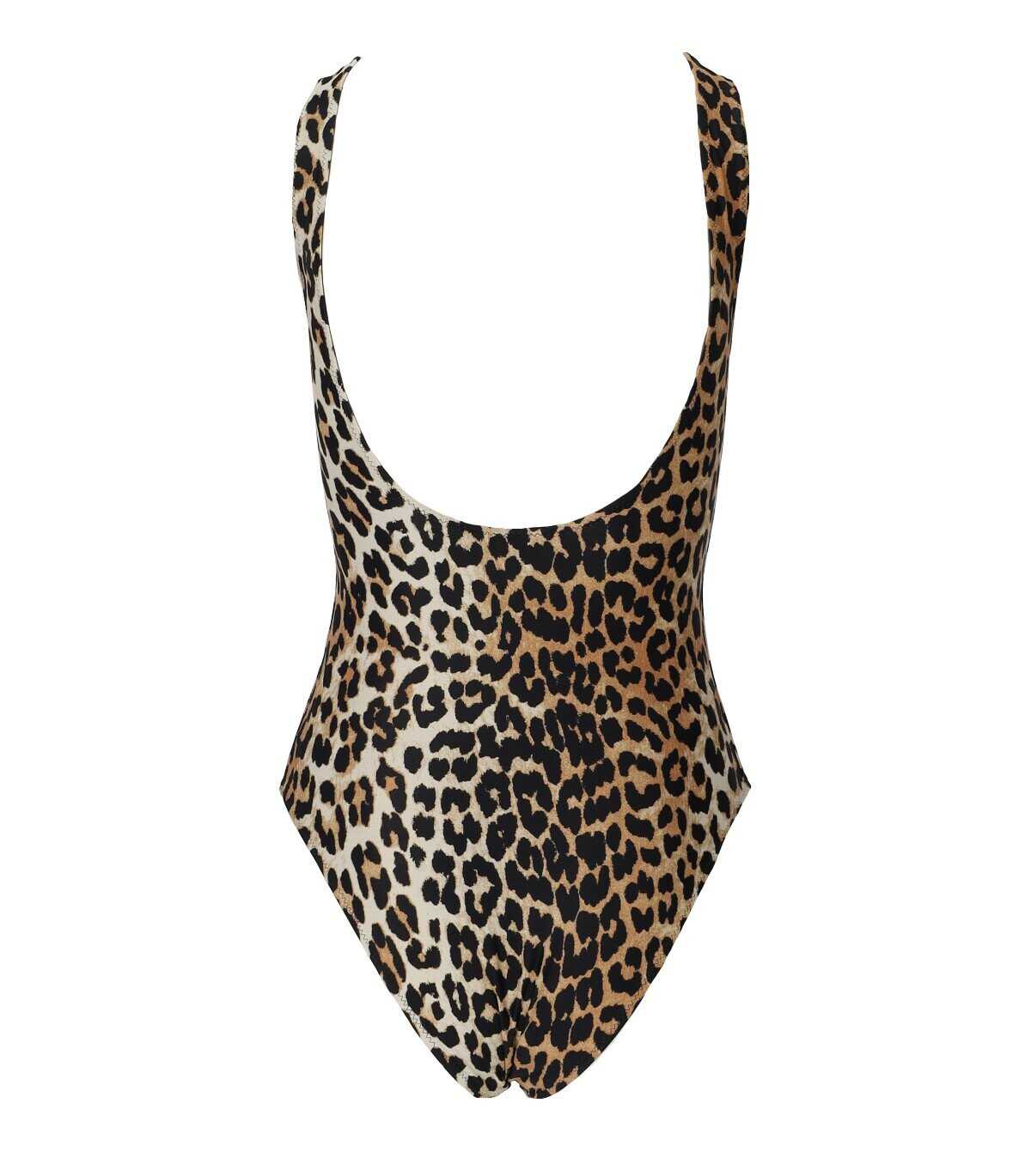 Ganni swimsuit made of technical fabric with leopard print in shades of brown and black. Logo on the front, wide neckline on the back. Unpadded cups.