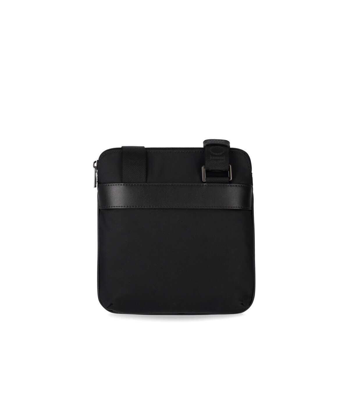 Crossbody bag by Emporio Armani made of black recycled nylon with metal logo on the front. Zip closure, inside pocket, and front zip pocket. Adjustable shoulder strap, measures 21x24x3 cm.