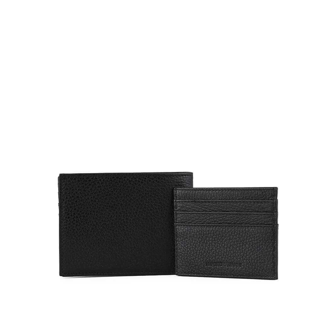 Emporio Armani set consisting of wallet and card holder in black hammered leather, decorated with matching logo. Wallet measures 12.5x8.5x2 cm, card holder measures 10x8 cm.