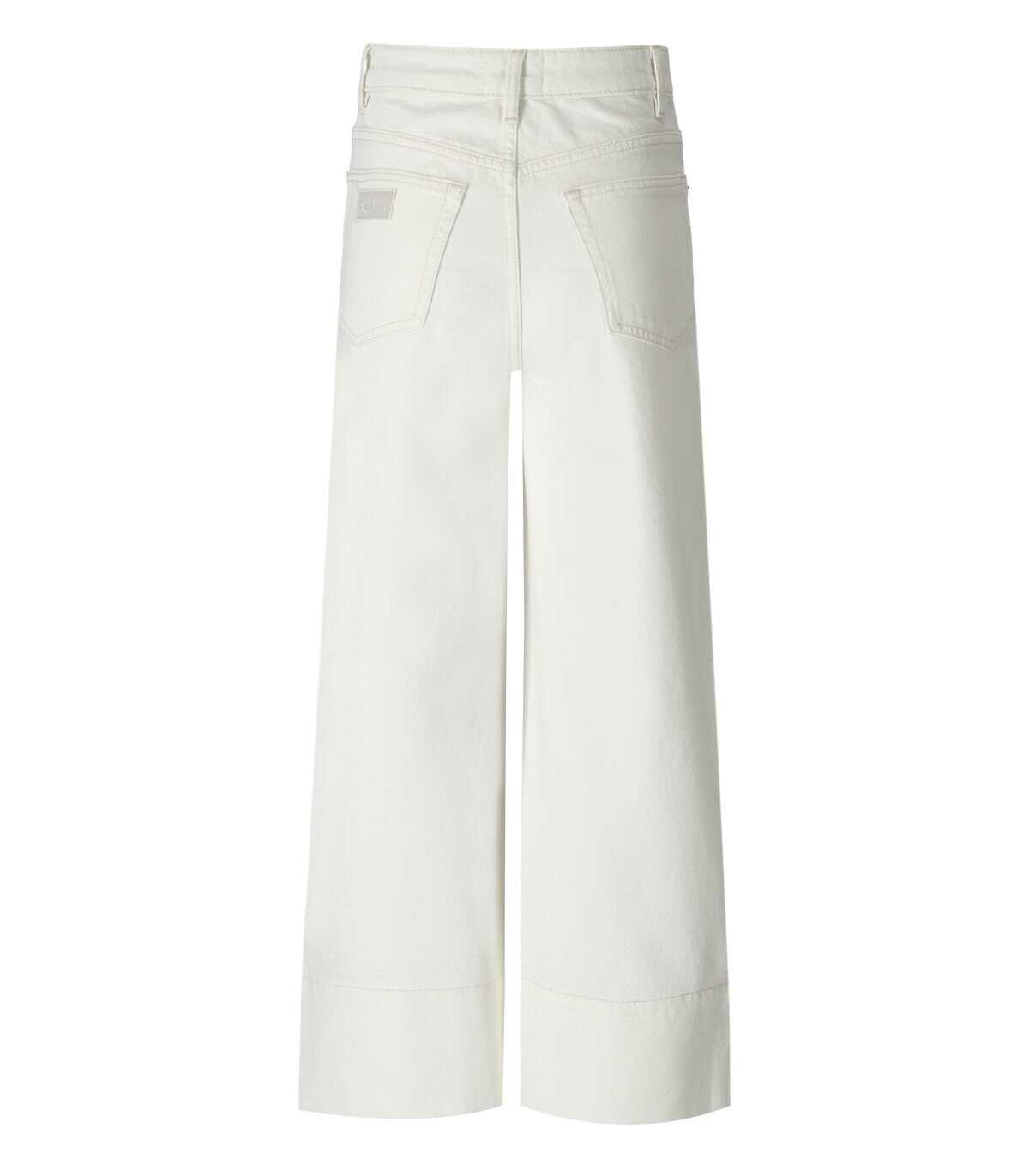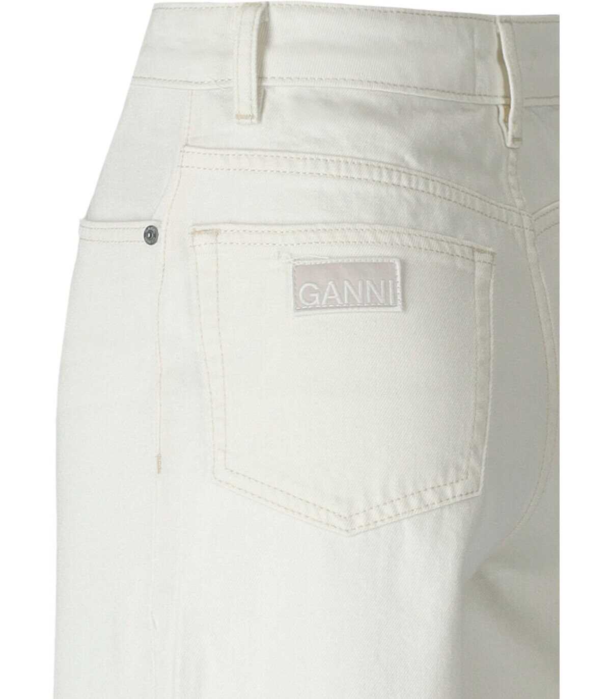 Ganni jeans made of white denim. High waist, five pockets, zip and button closure and logo detail on the back. Wide leg.