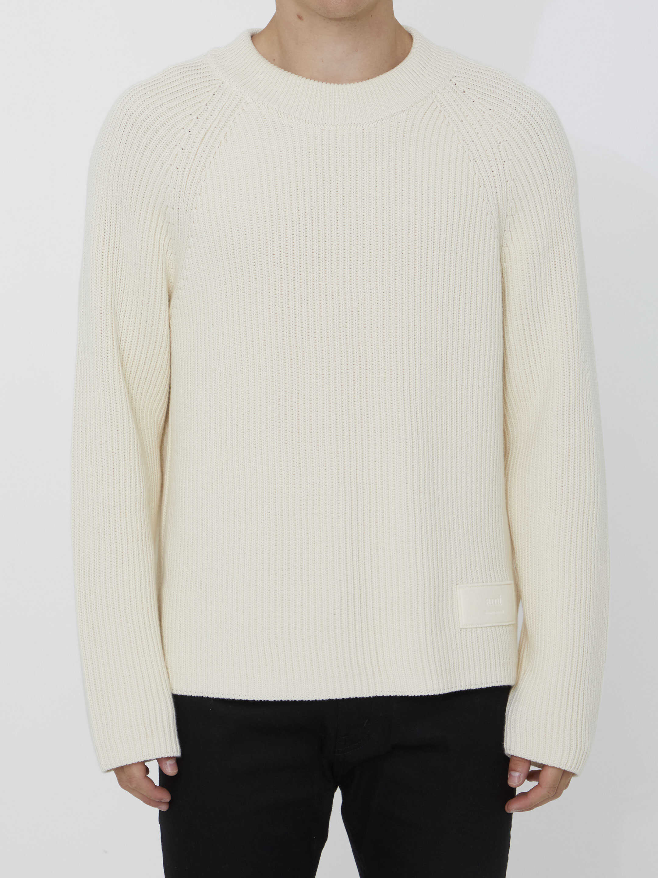 Long-sleeved crewneck jumper in ivory cotton and wool blend with front logo patch. Regular fit.
