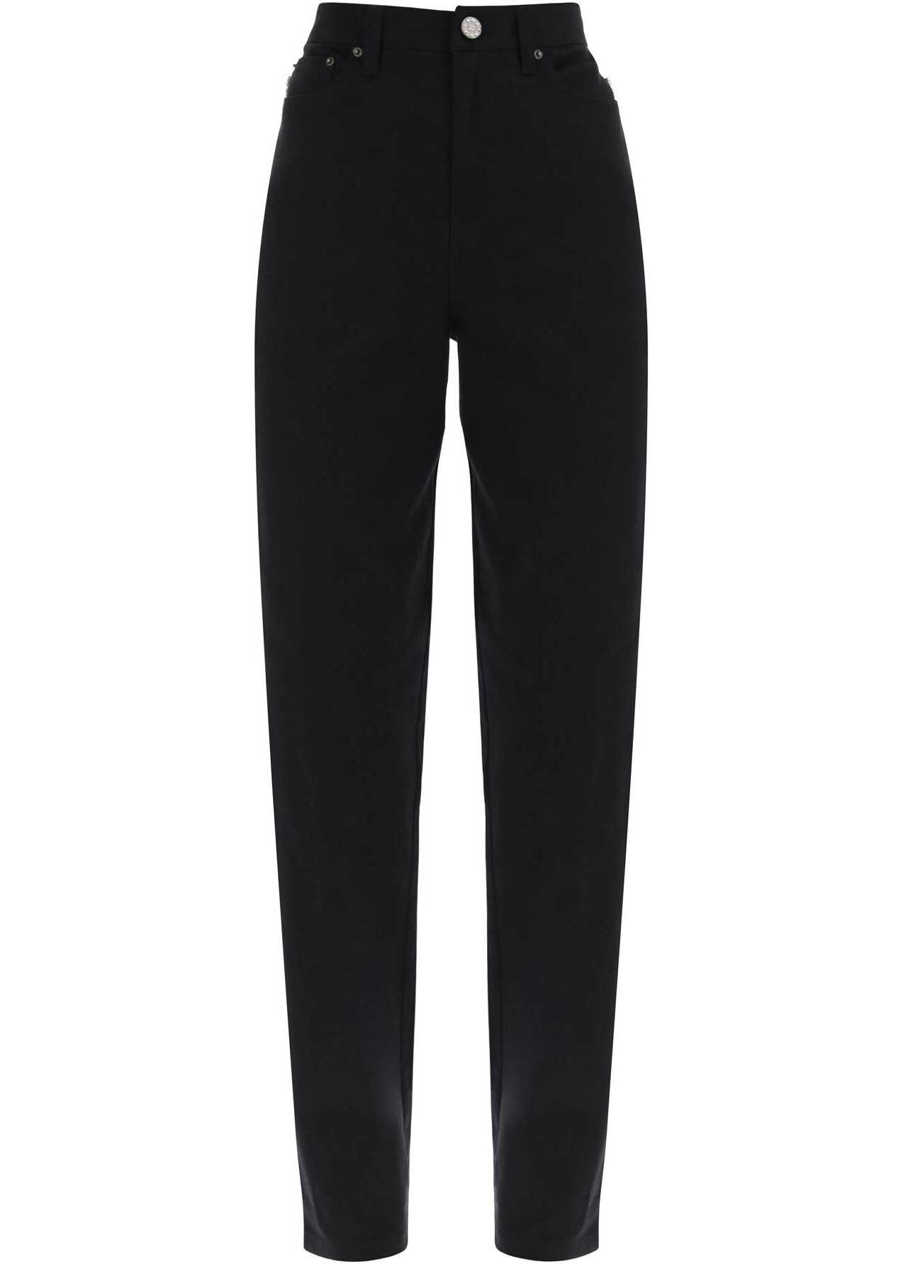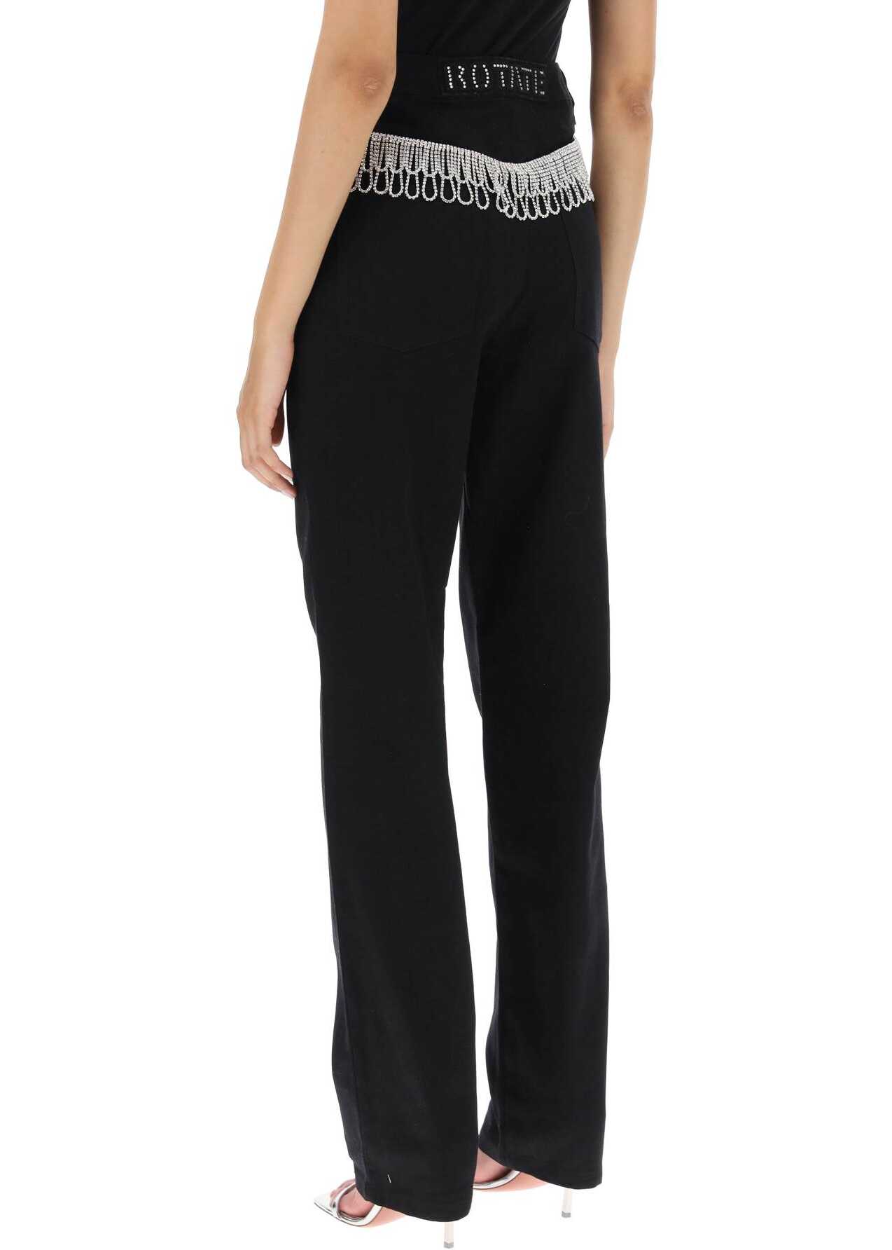 Rotate five-pocket jeans cut from lighweight organic denim to a straight silhouette. They sit high on the waist and flaunt bright crystal fringes on the back. This piece is finished with a front zip fly with button, belt loops, and a rhinestone-embellished logo patch on the back waistband. Regular fit. The model is 177 cm tall and wears a size 26.