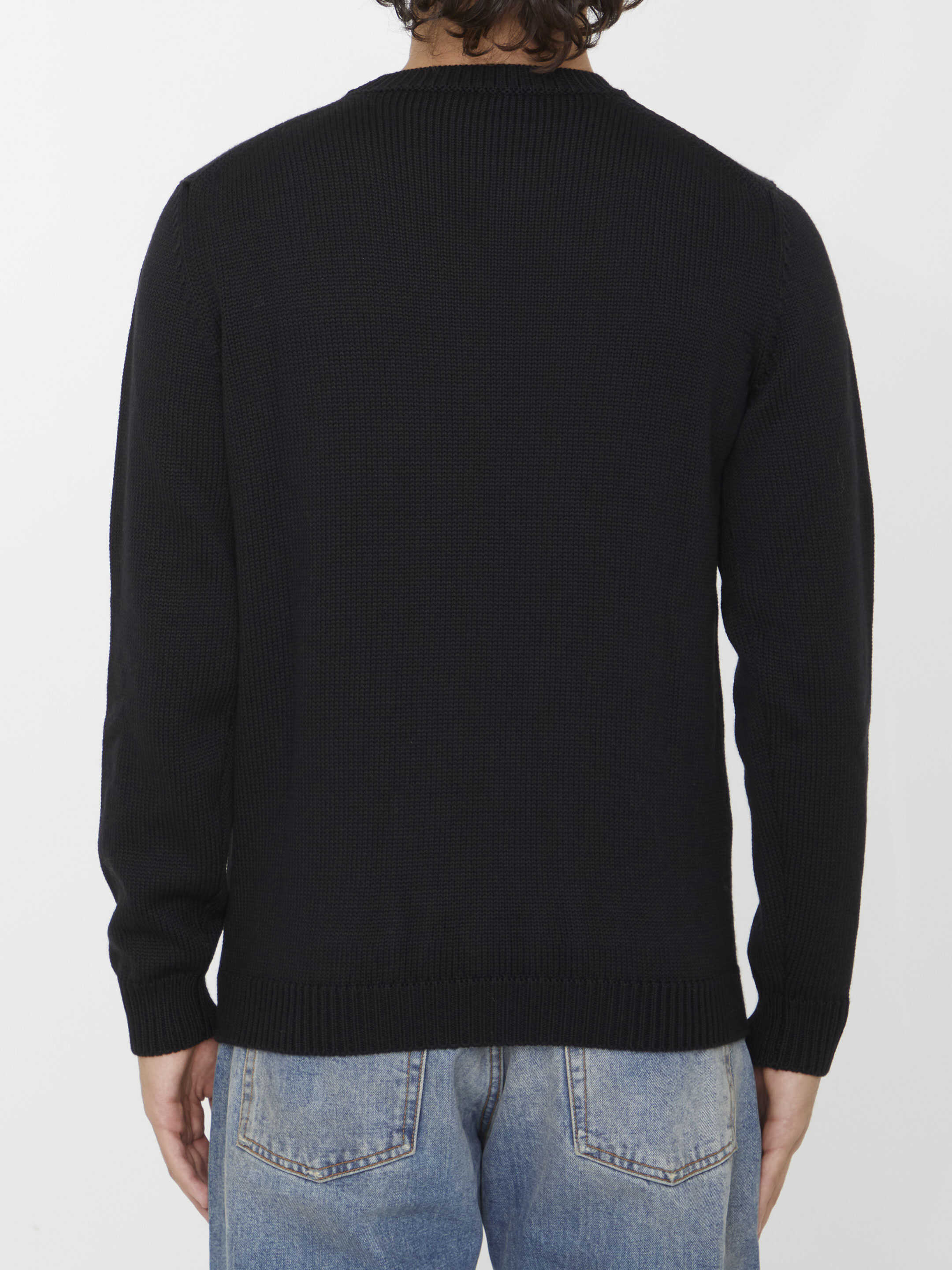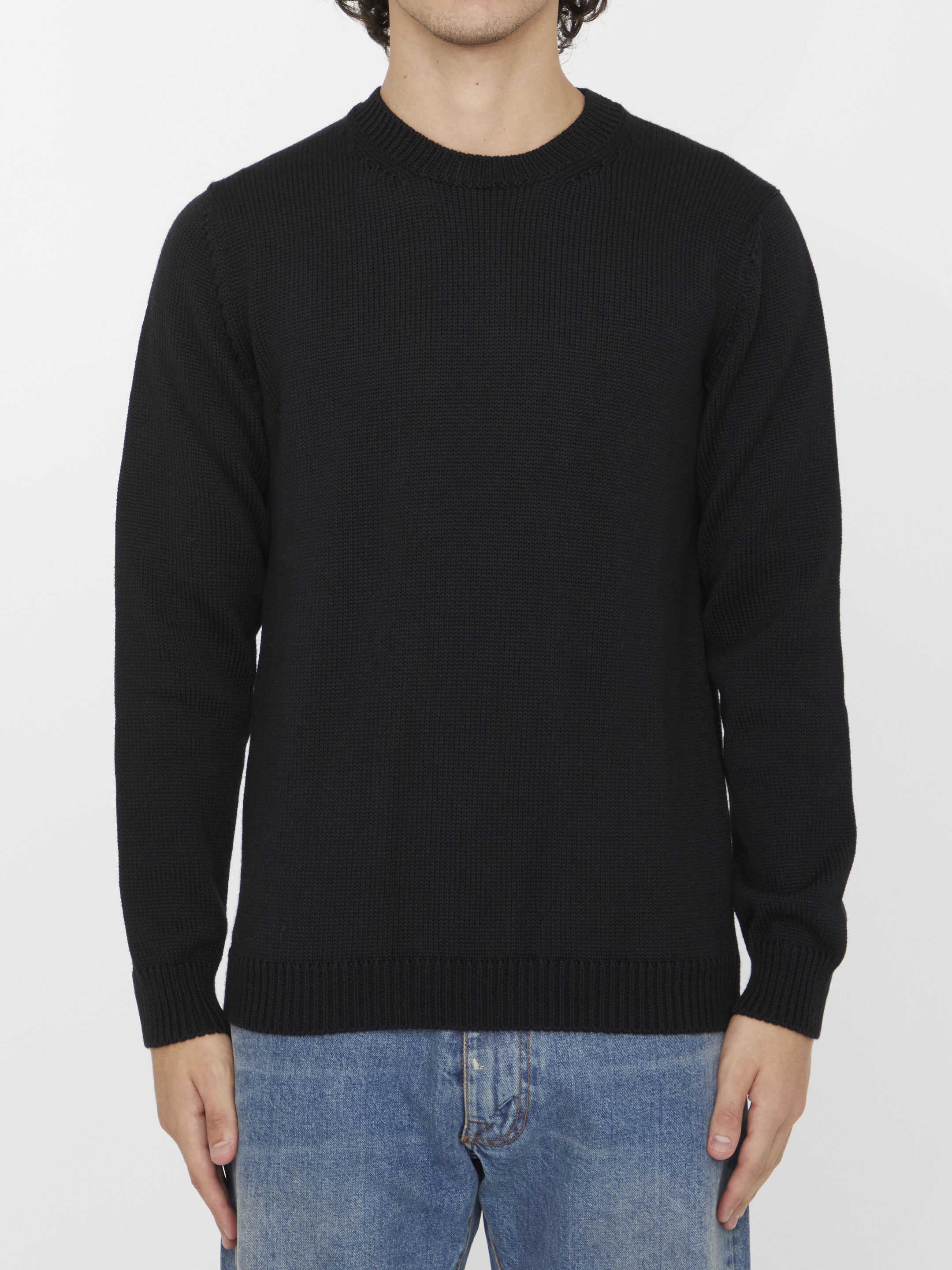 Long-sleeved crewneck jumper in black merino wool. Ribbed neck, cuffs and hem. Regular fit.