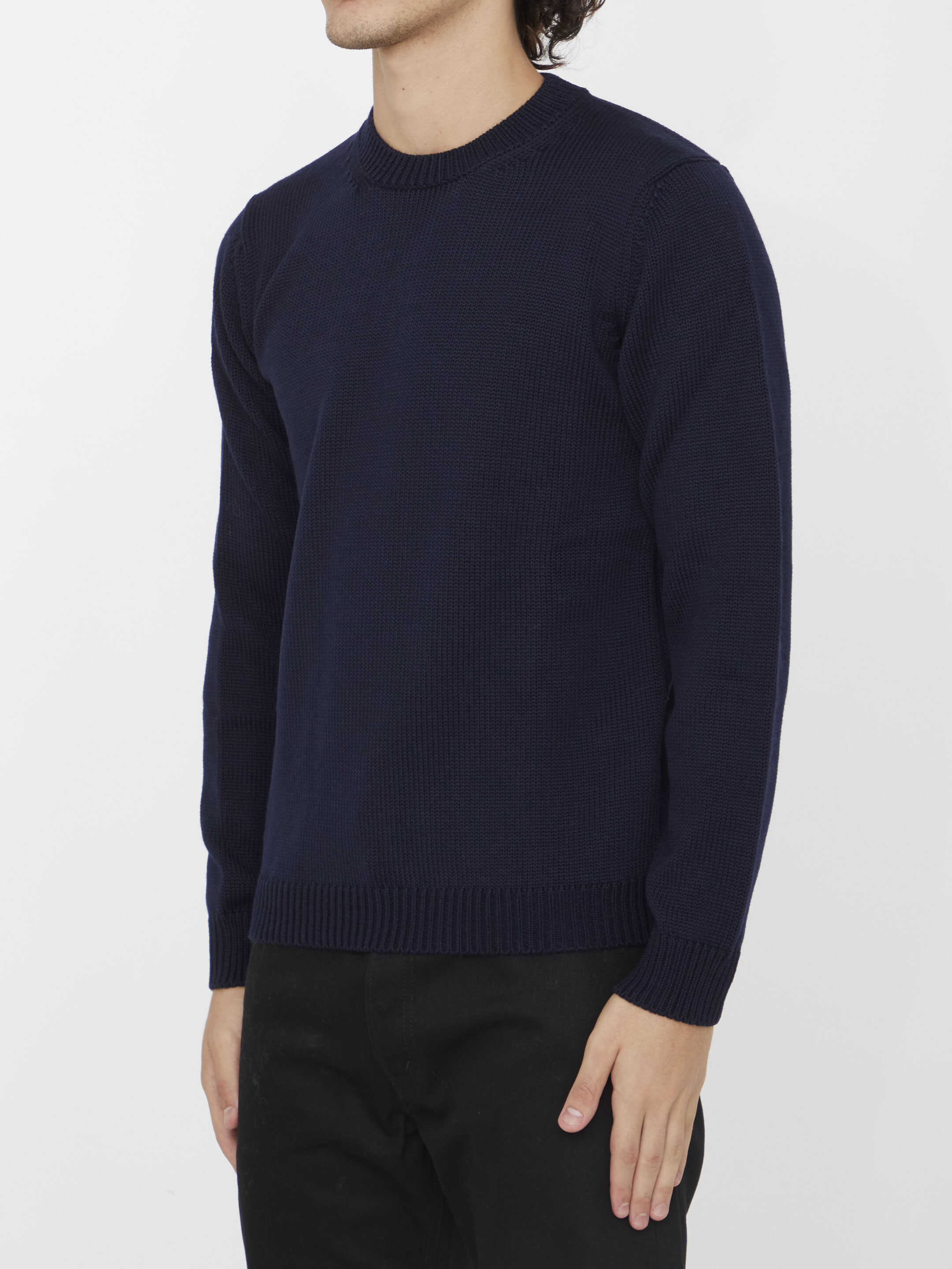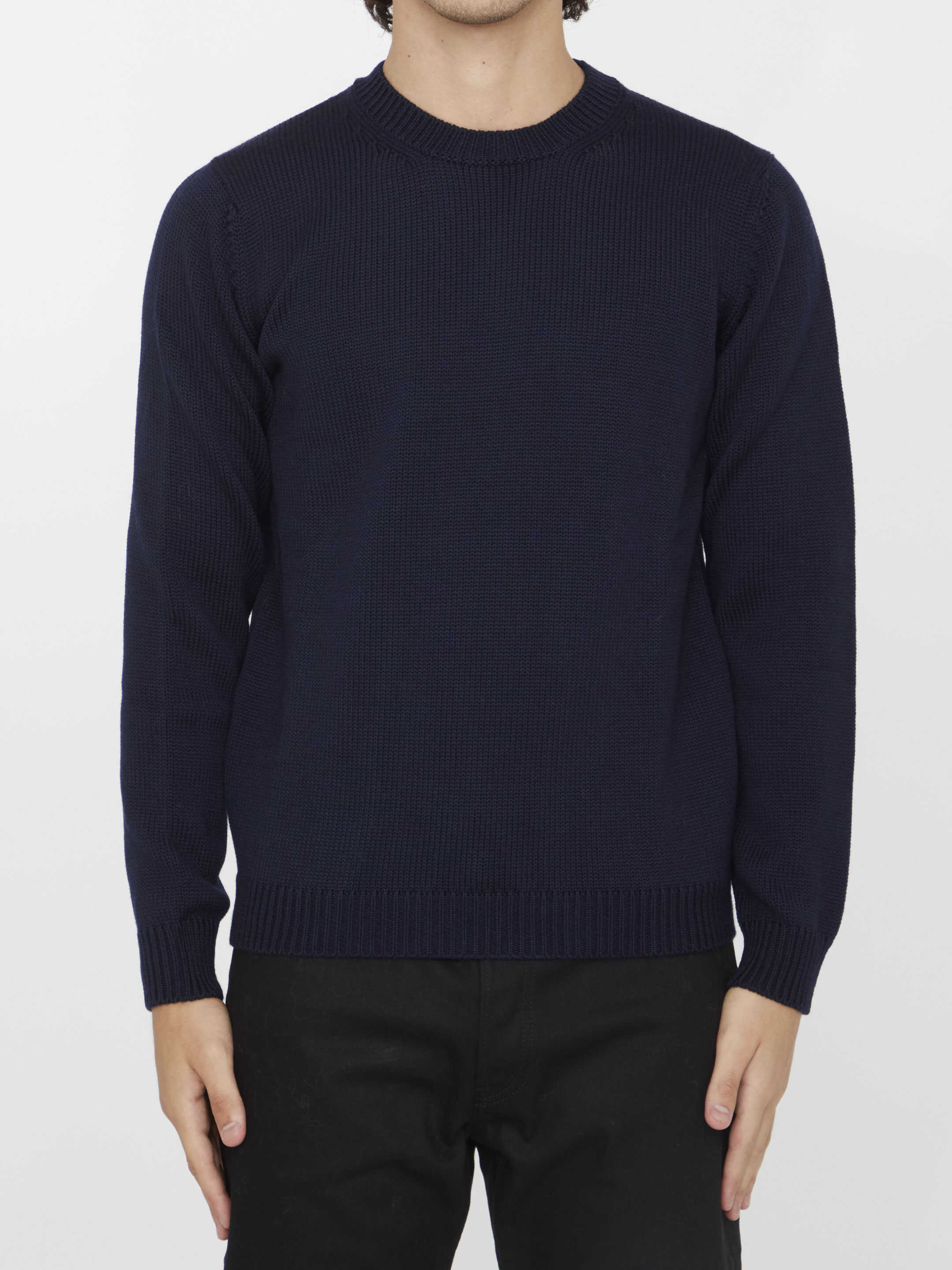 Long-sleeved crewneck jumper in blue merino wool. Ribbed neck, cuffs and hem. Regular fit.