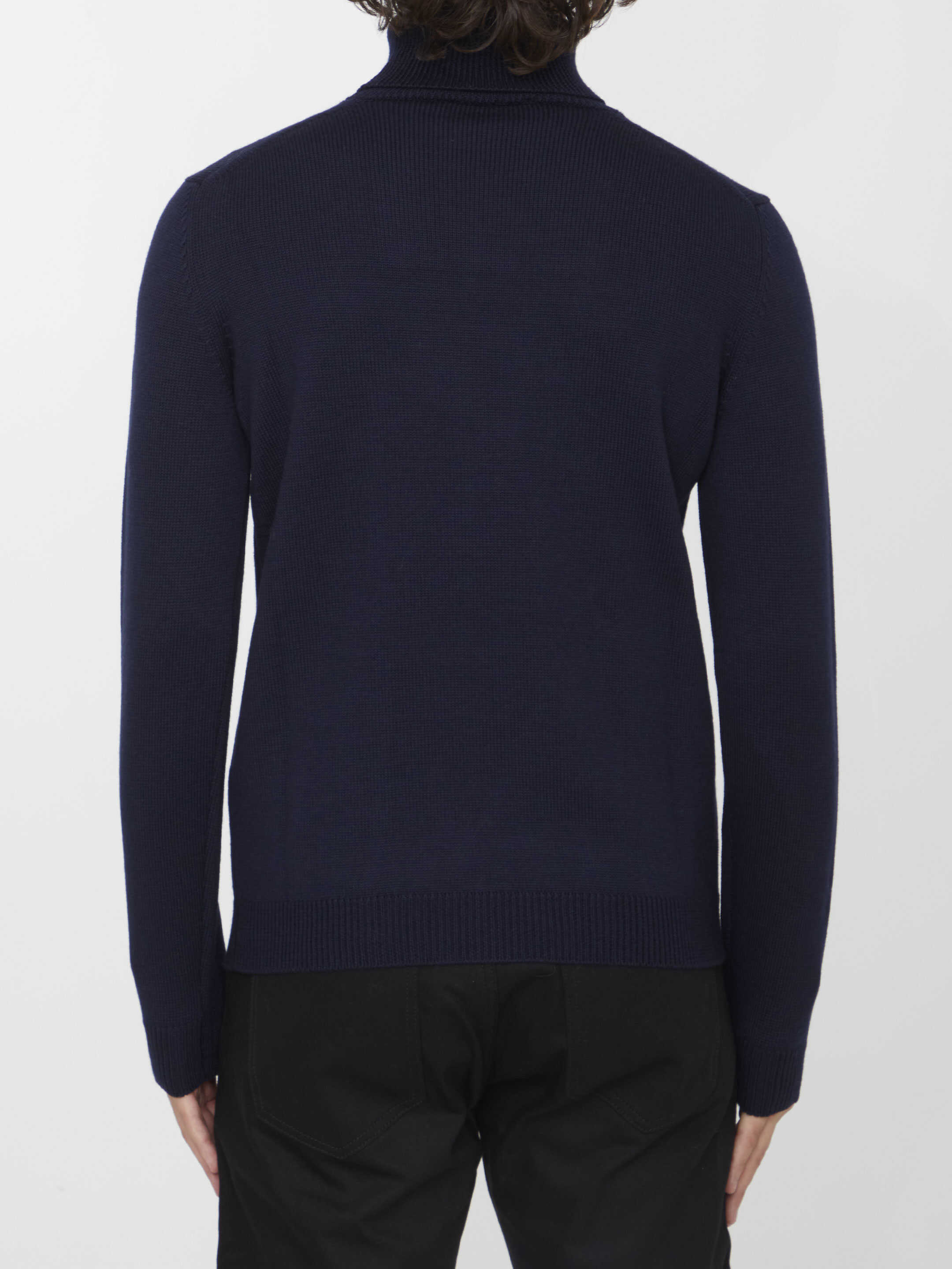 High-neck jumper in blue merino wool with ribbed design. Regular fit.