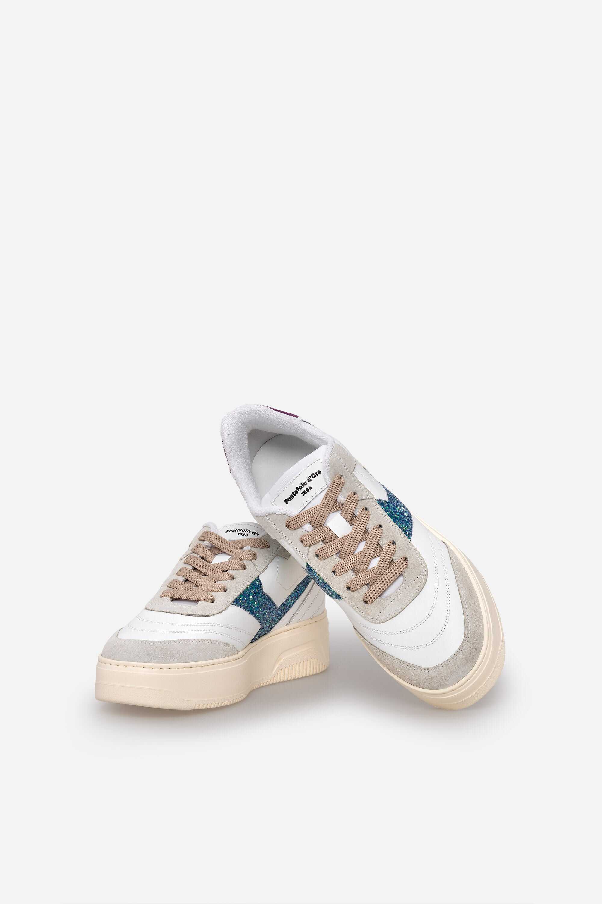Step up your sneaker game with these Pantofola D'oro Crossball Women's Sneakers. Made in Italy with high-quality calf leather, these lace-up sneakers feature retro details and a contemporary silhouette. The white leather uppers are accented with pink and green glitter detailing and the famous logo on the heel. The rubber sole ensures durability and comfort. Perfect for effortlessly cool Italian style, these sneakers are a must-have for any fashion-forward woman. Available in size 41.